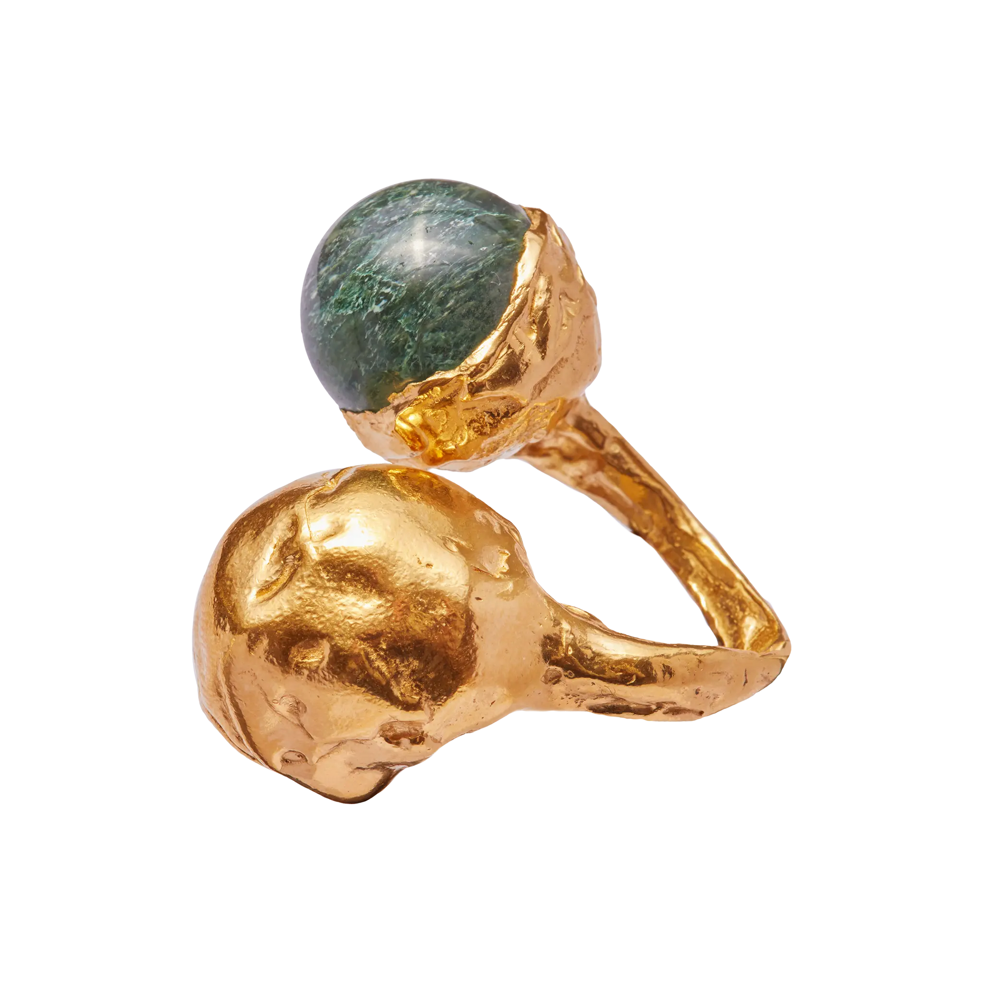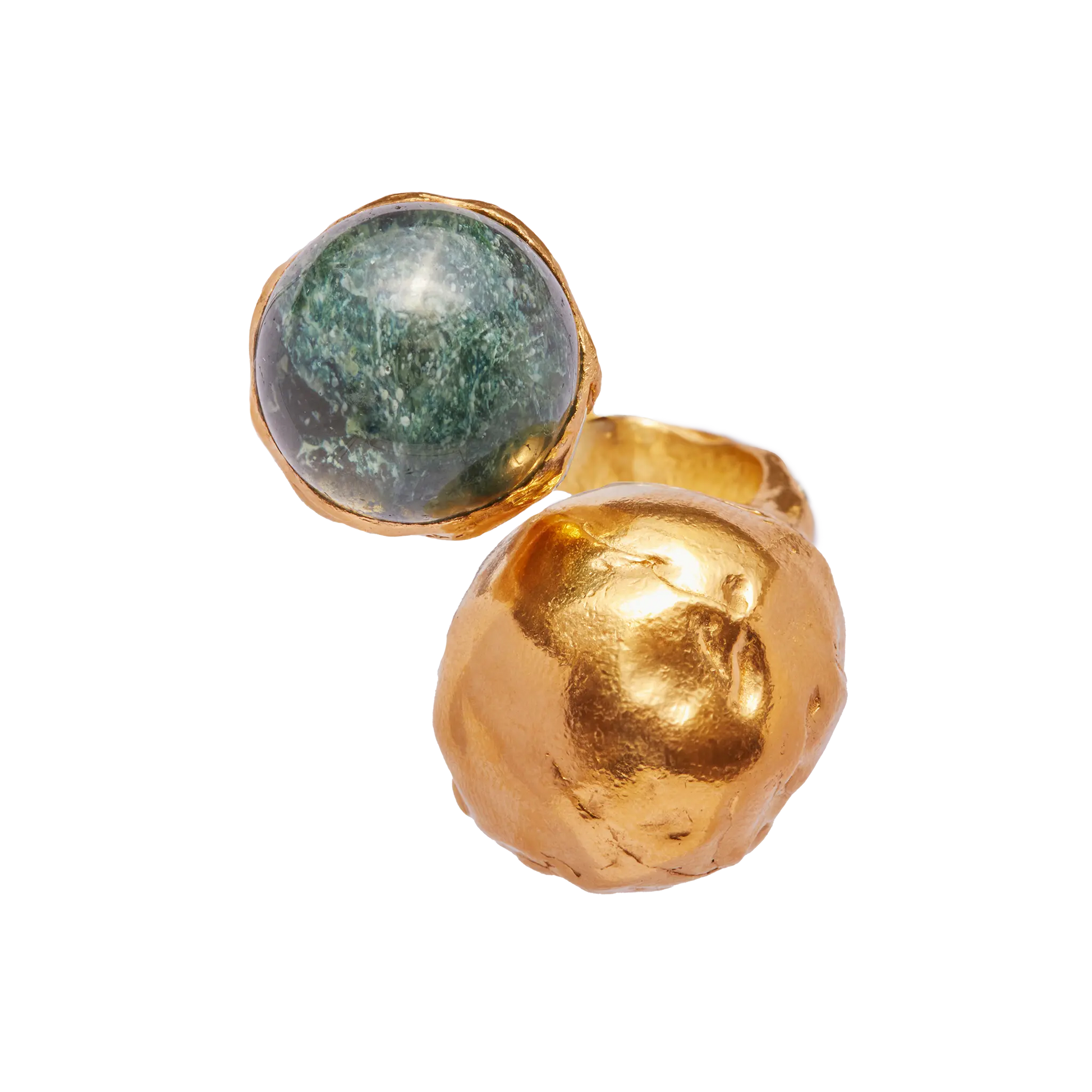Guinda Melón, handmade gold plated recycled 925 sterling silver ring with white dark green stone.