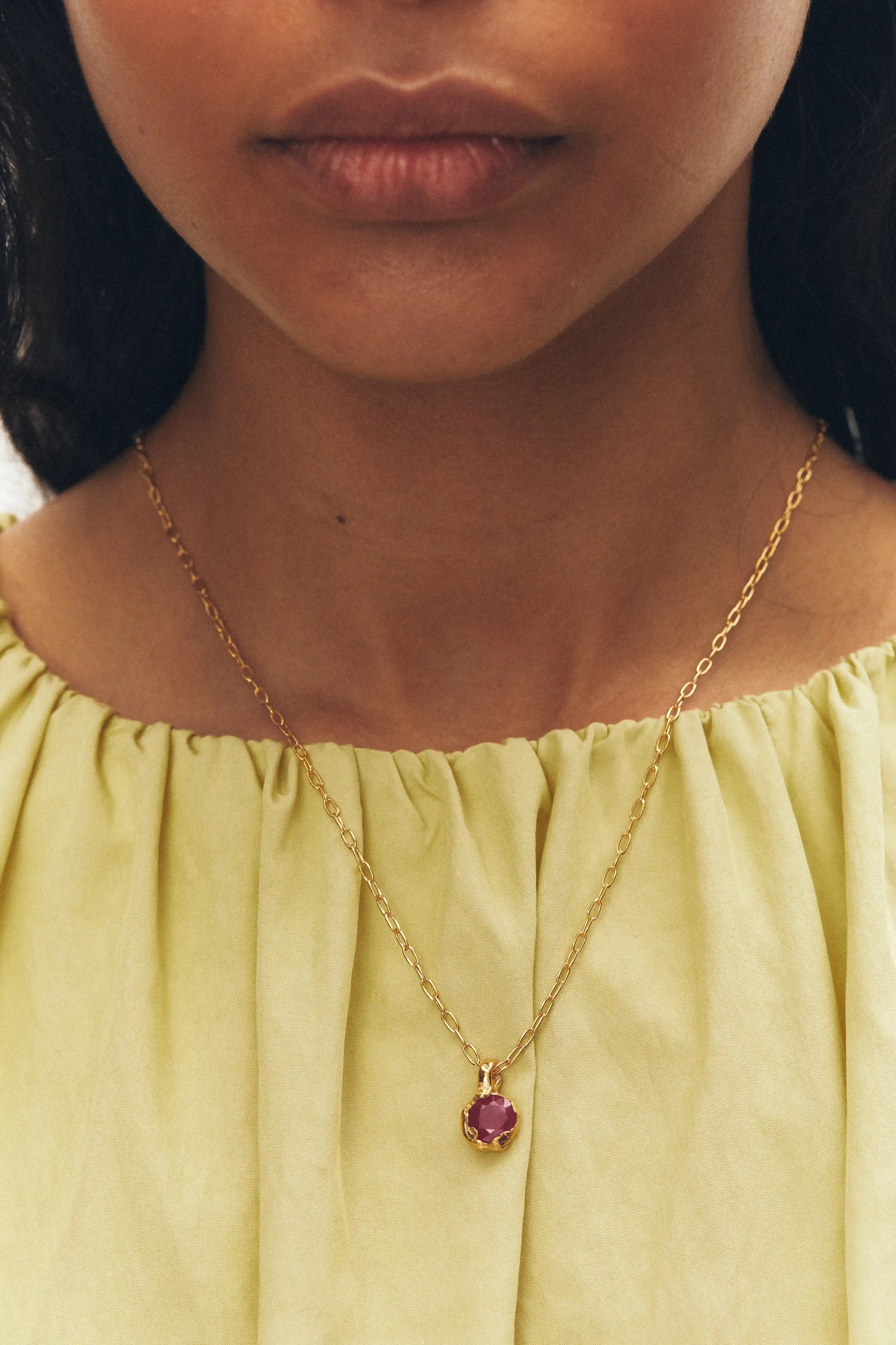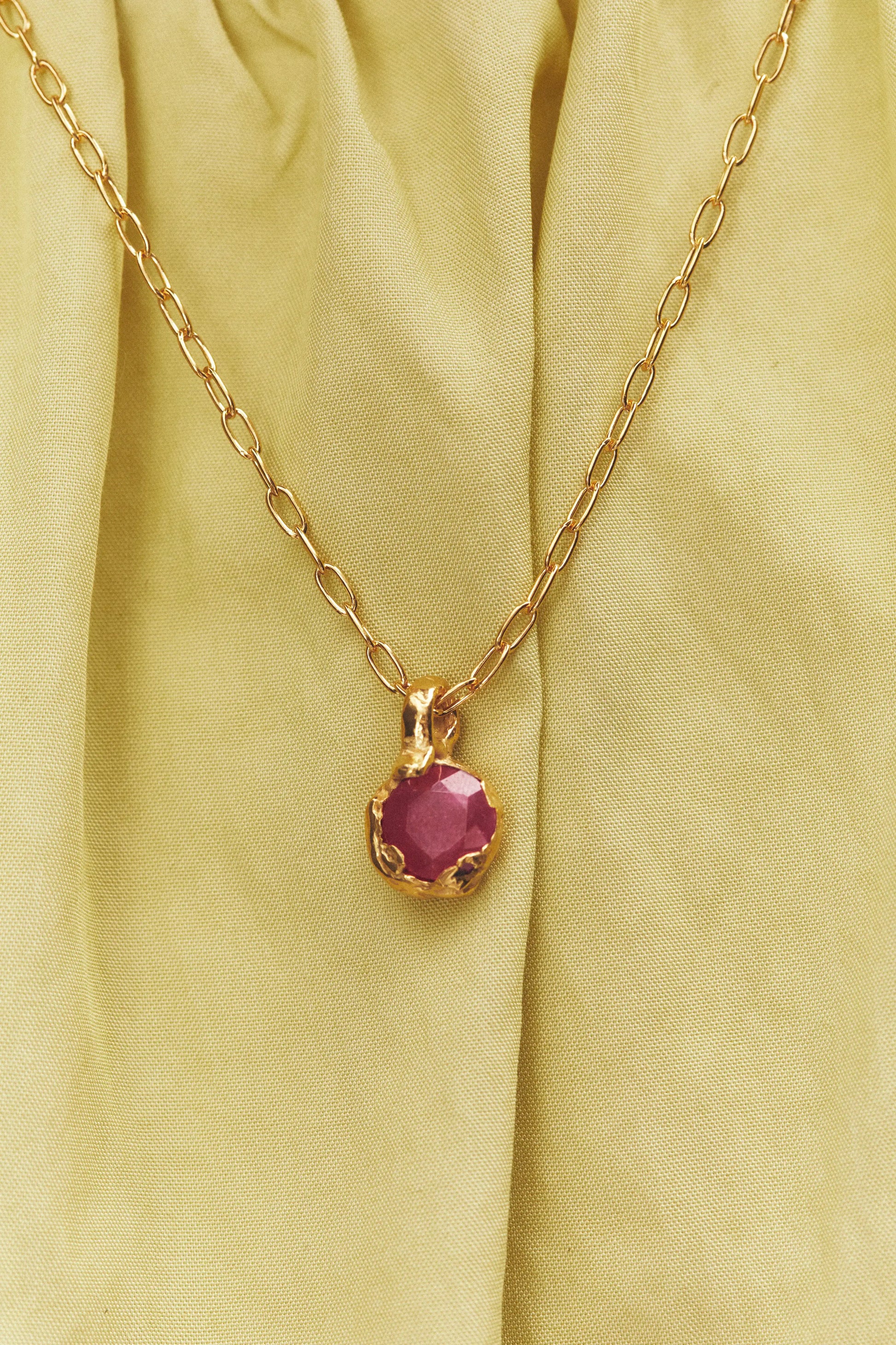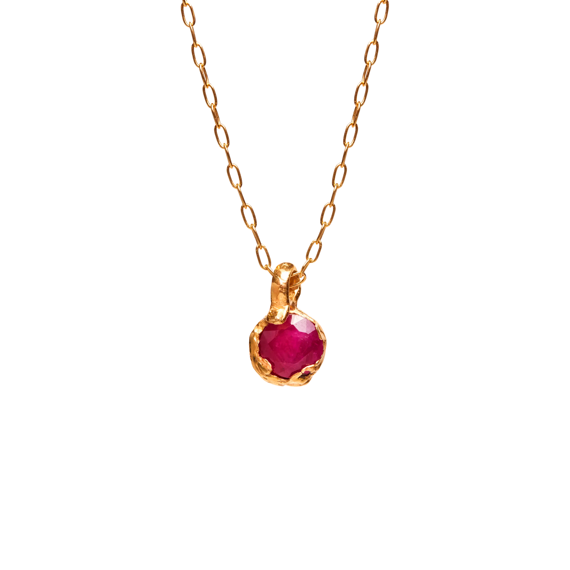 Julio, handmade gold plated necklace with a natural Ruby gem.