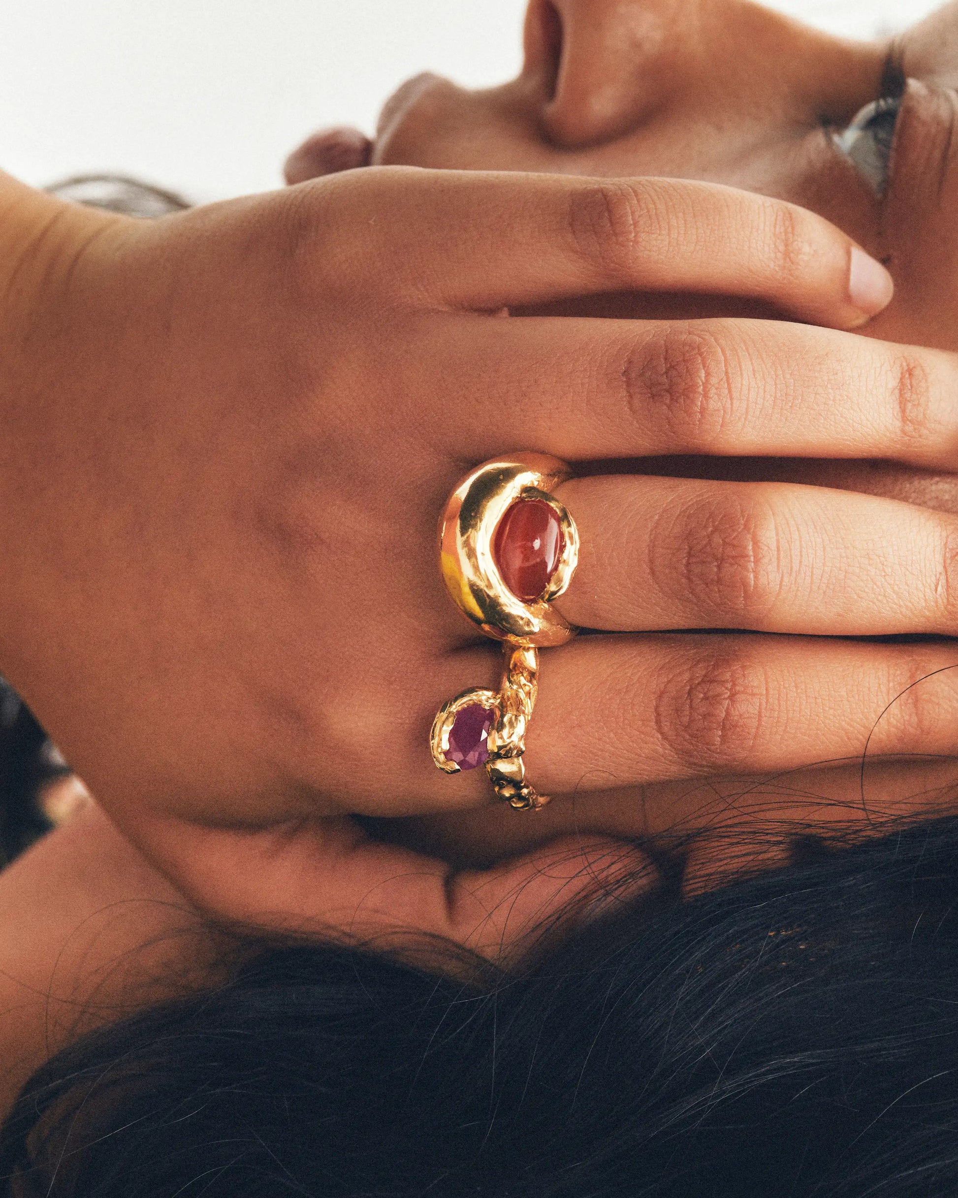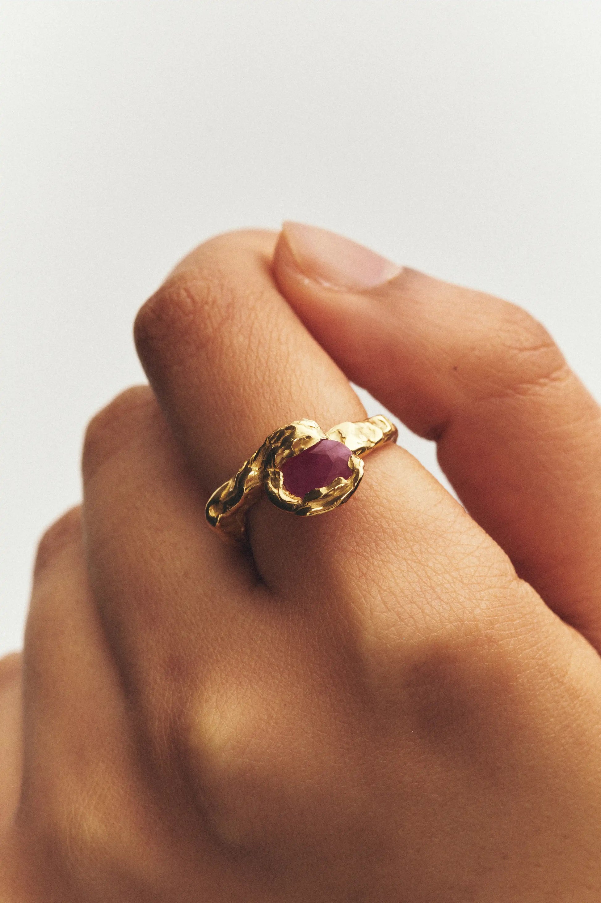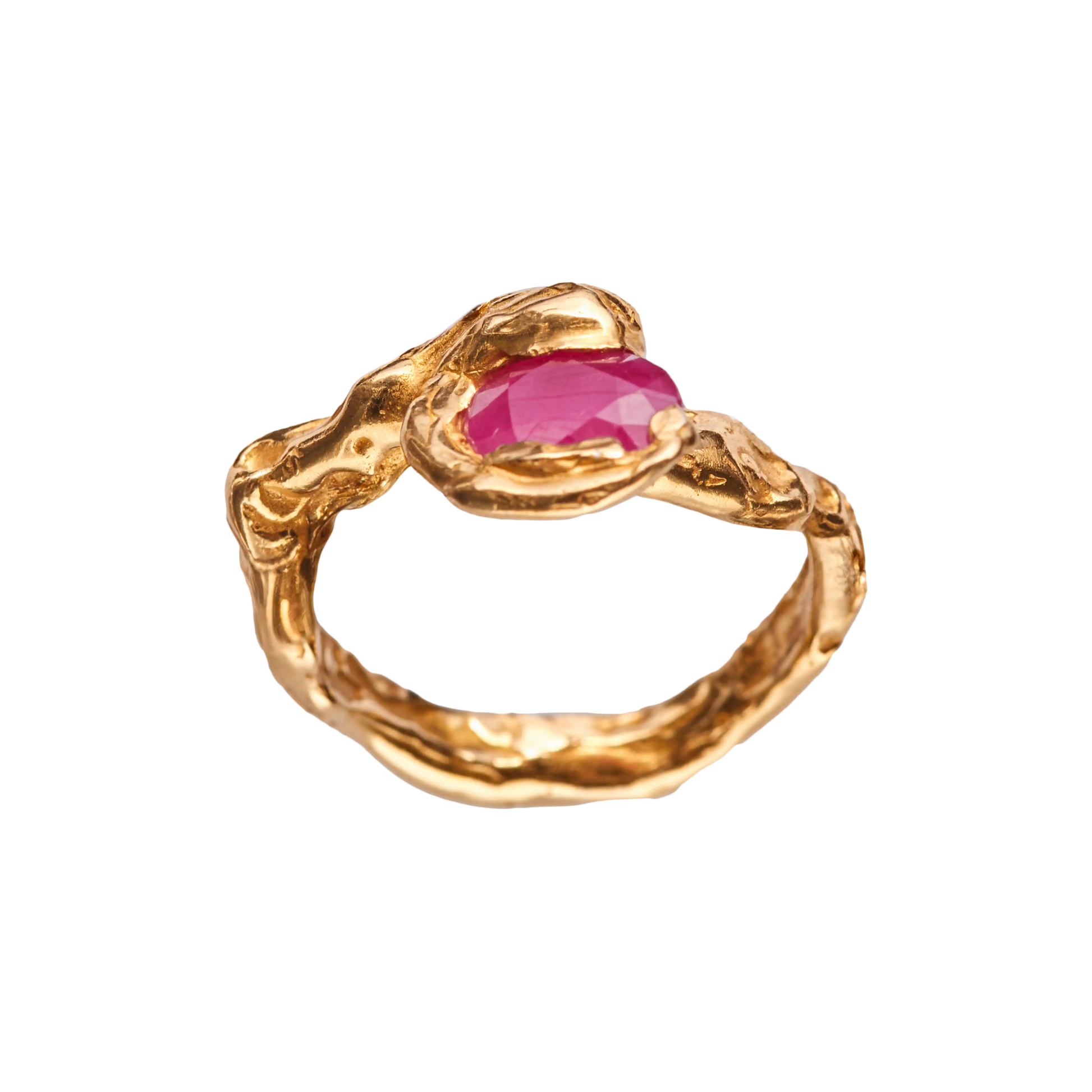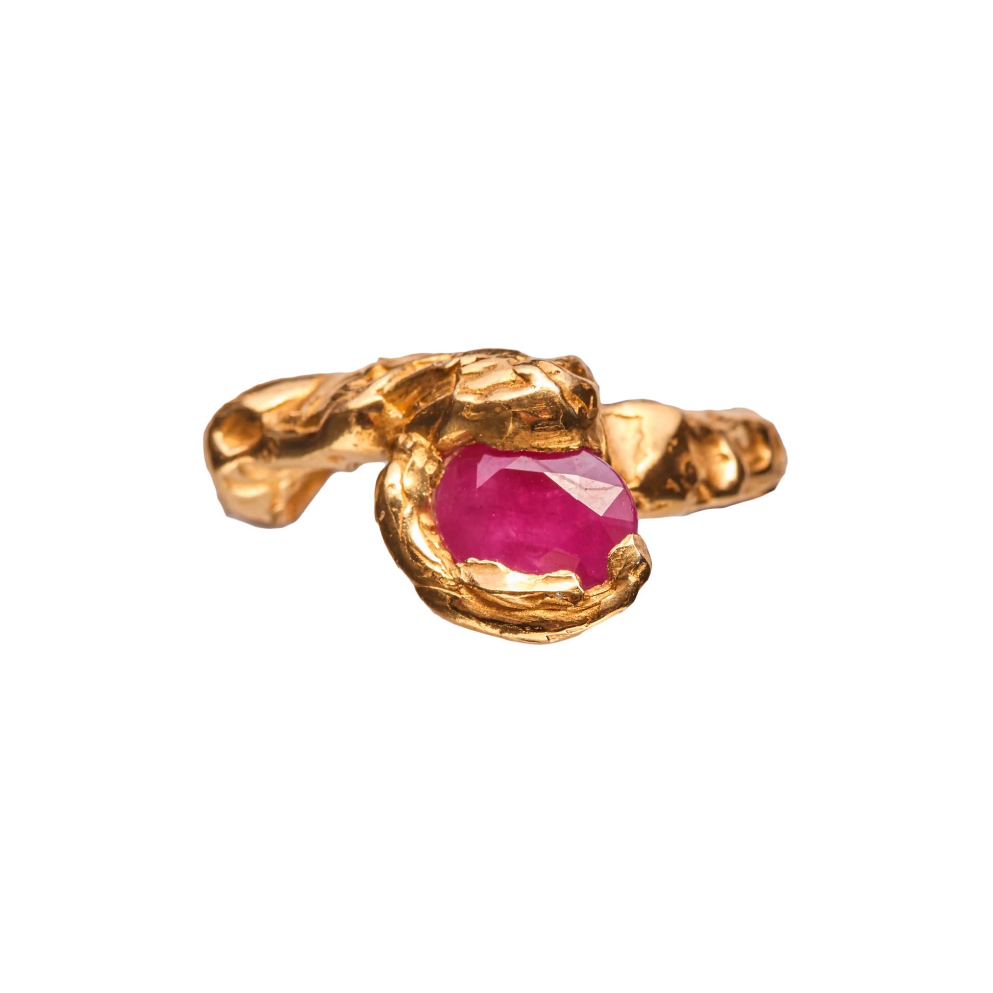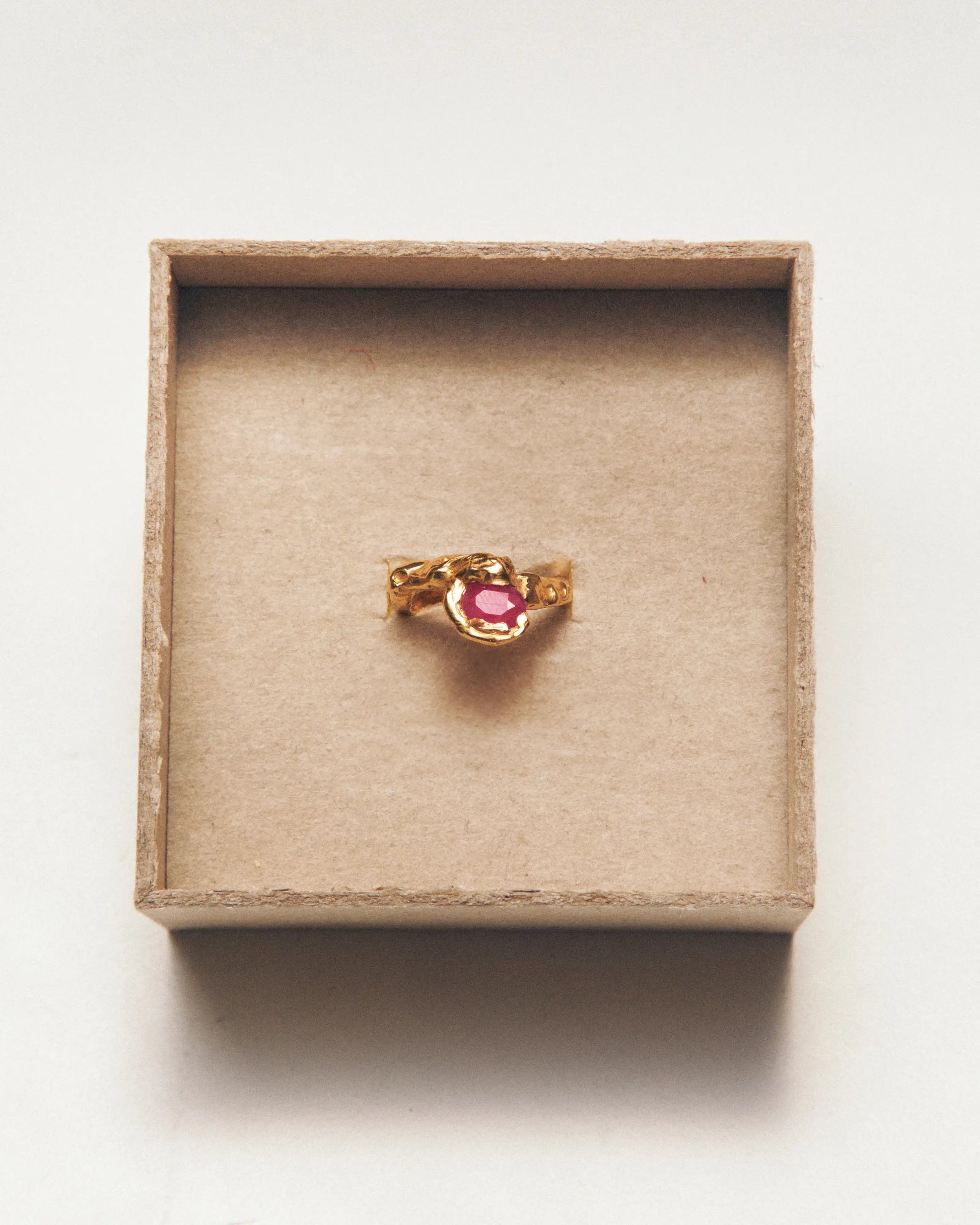 Julio, handmade gold plated recycled 925 sterling silver ring with a natural Ruby gem.