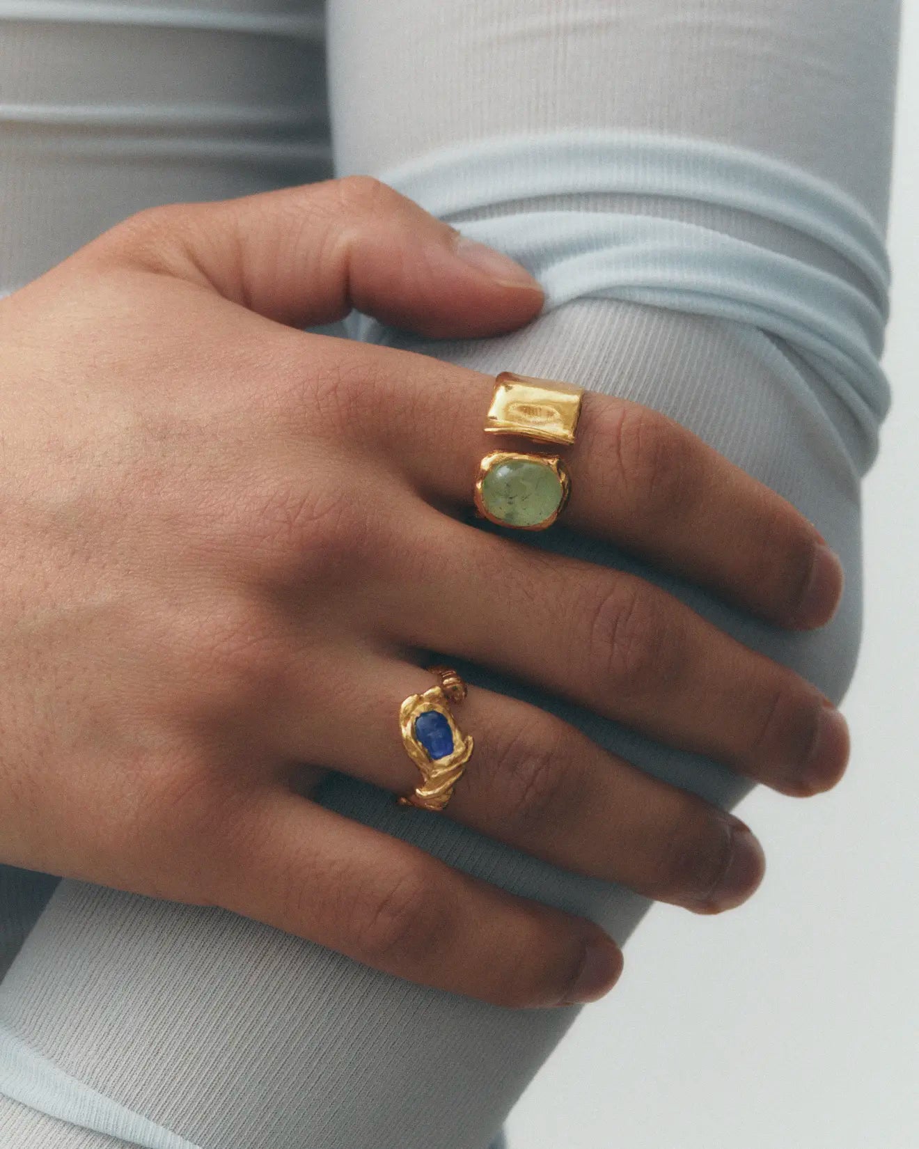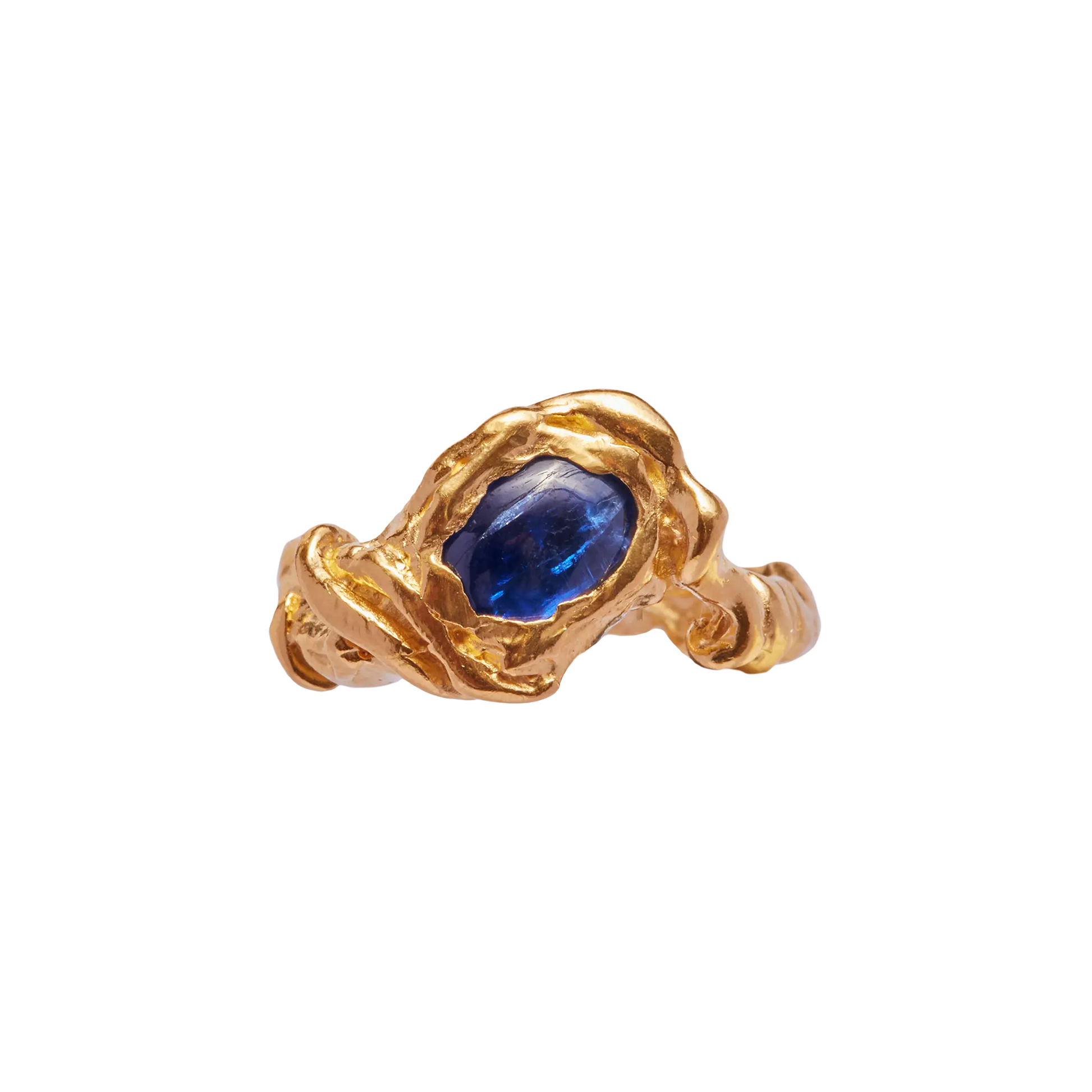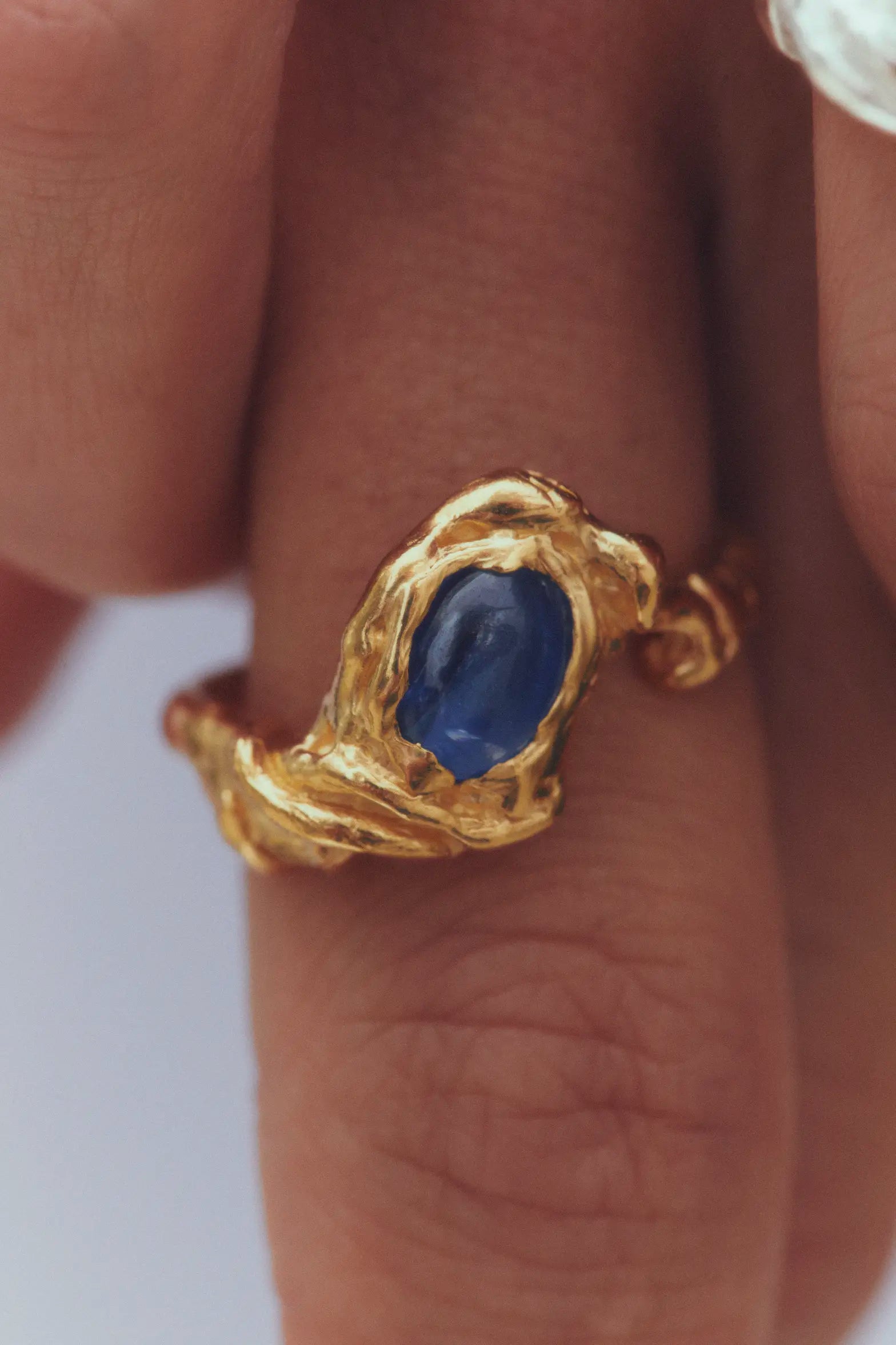 Liana, handmade gold plated recycled 925 sterling silver ring with Kyanite Cabochon natural stone. Los Peces Collection.