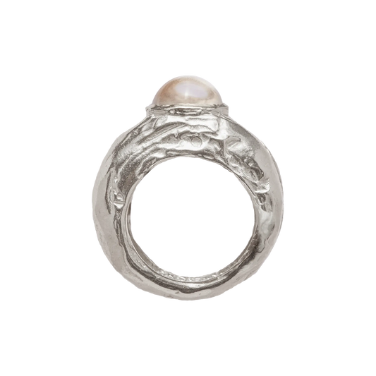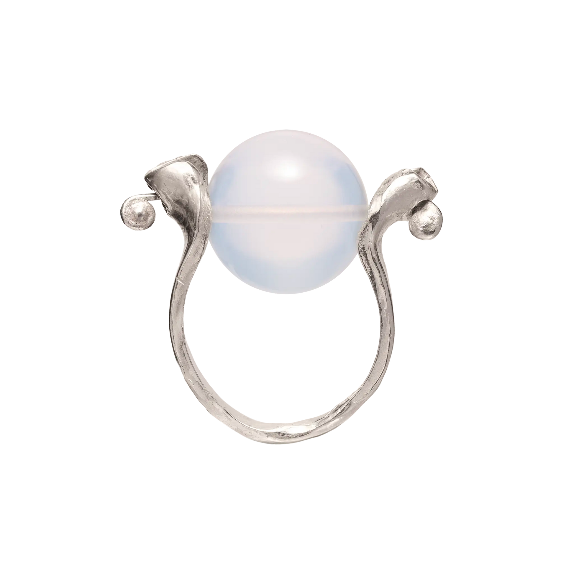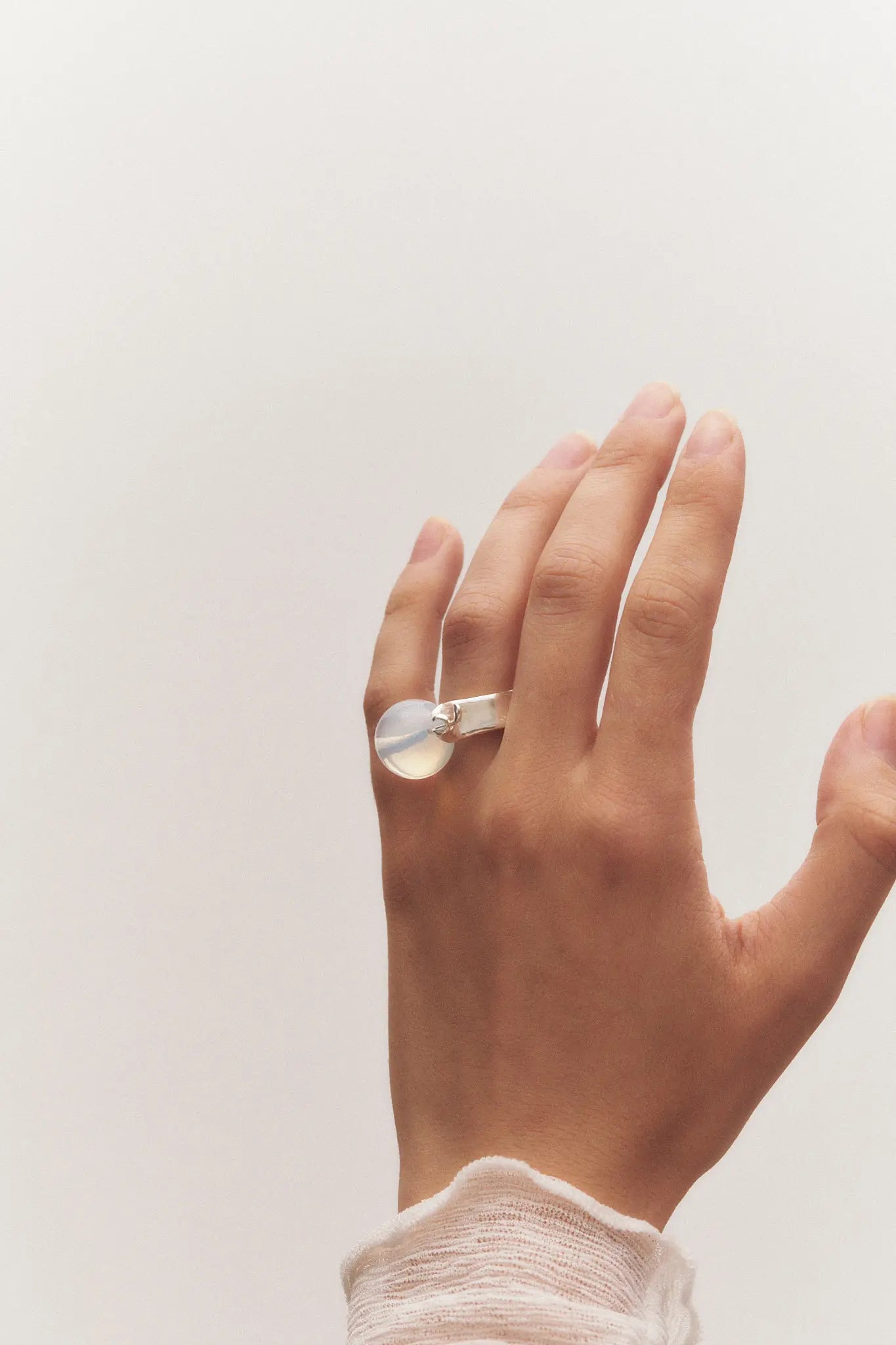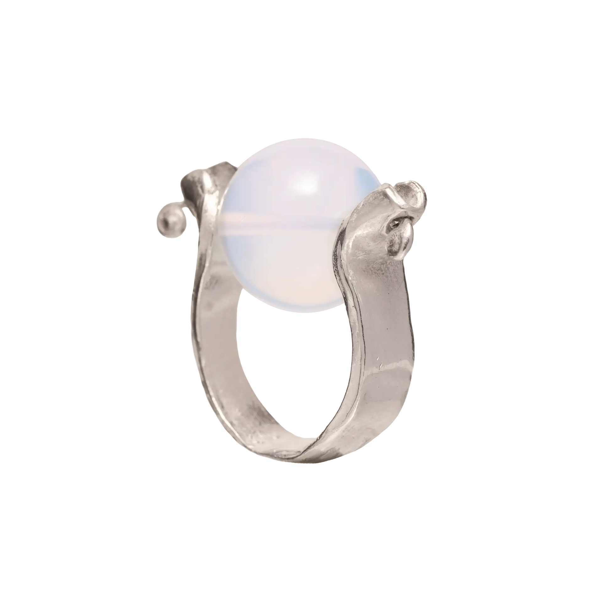Lira, handmade recycled 925 sterling silver ring with white glass stone.
