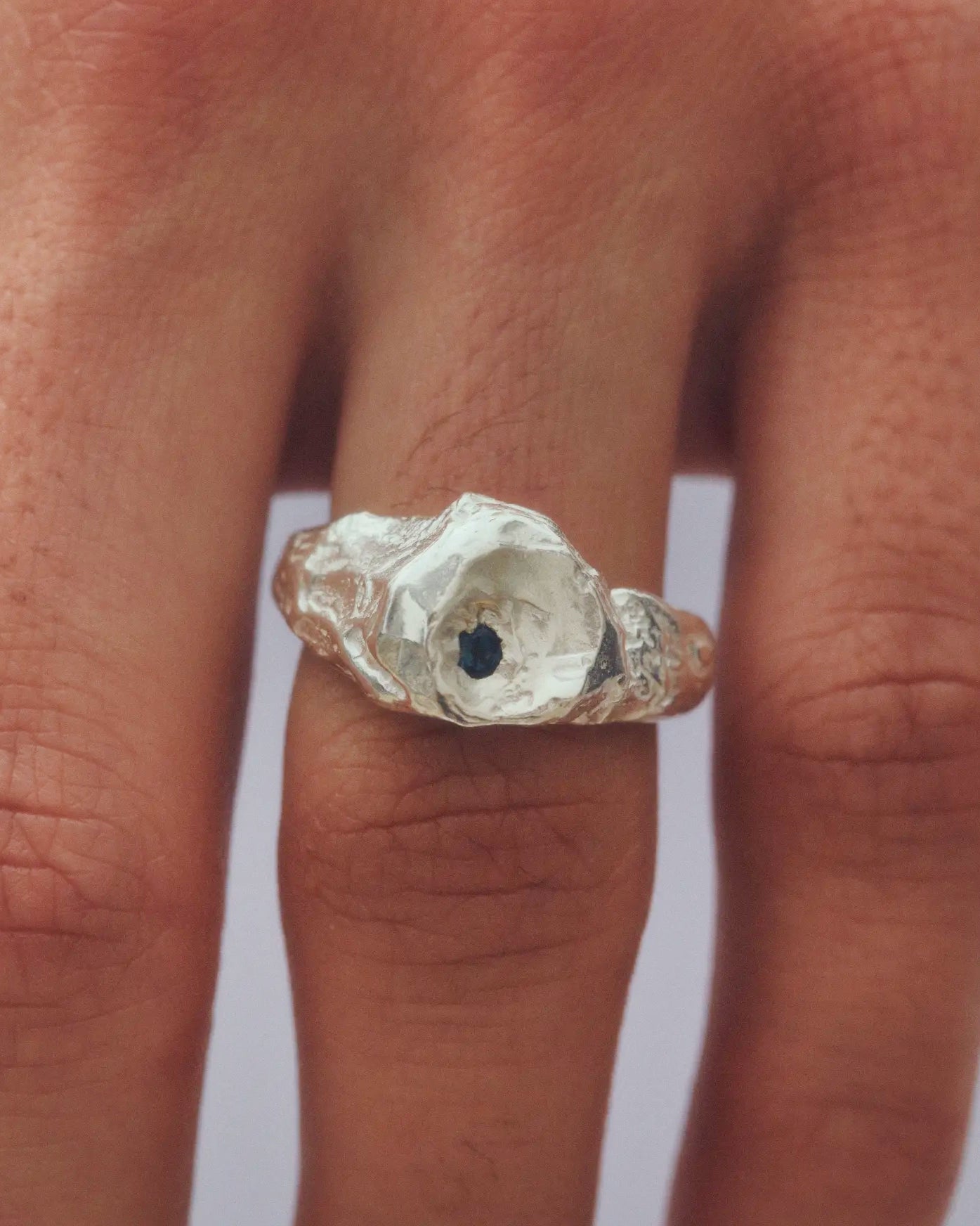 Marea Blue, handmade recycled 925 sterling silver ring with natural London Blue Topaz stone.