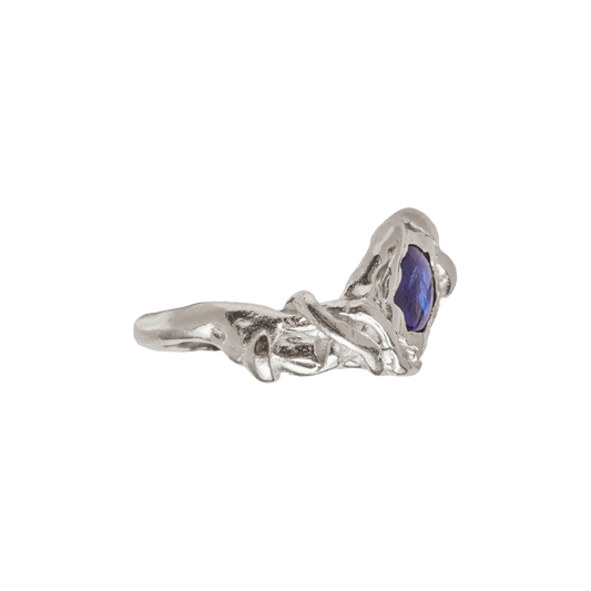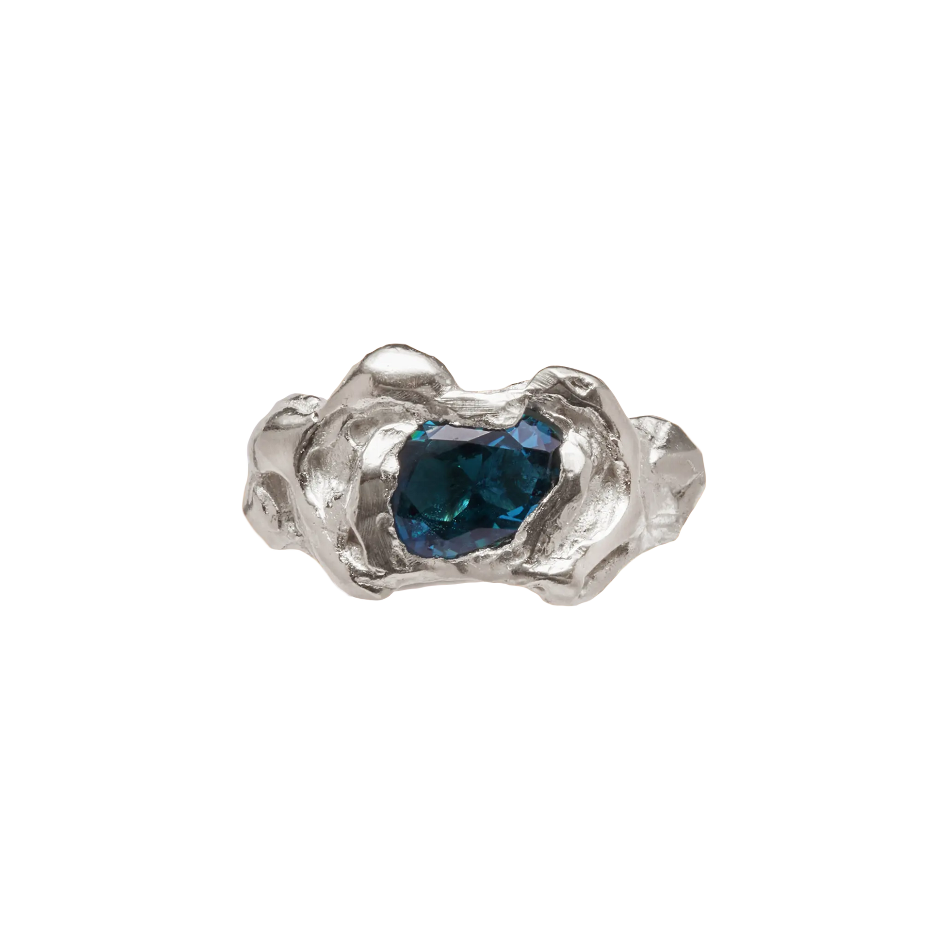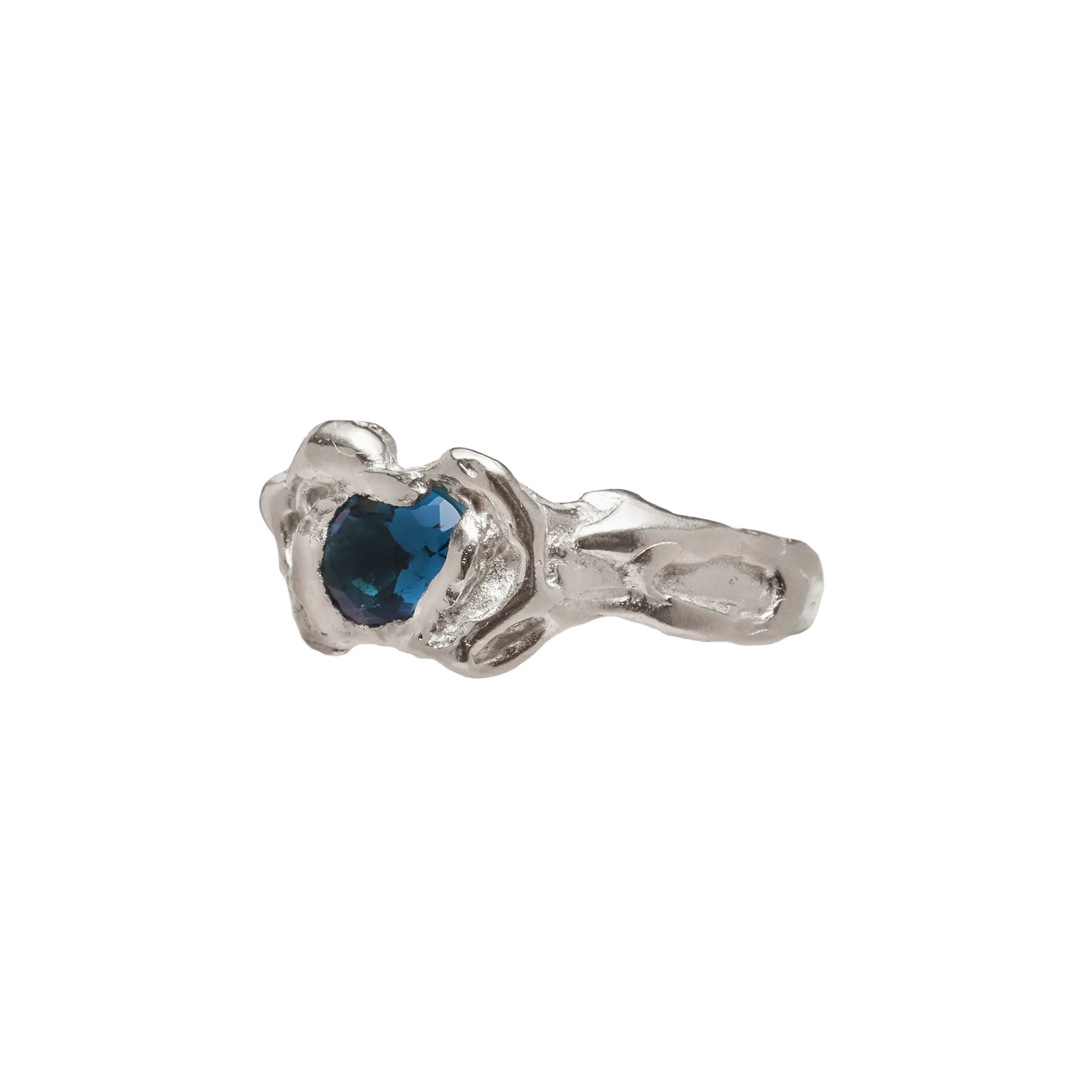 Ola Blue, handmade recycled 925 sterling silver ring with blue Topaz Cz stone.