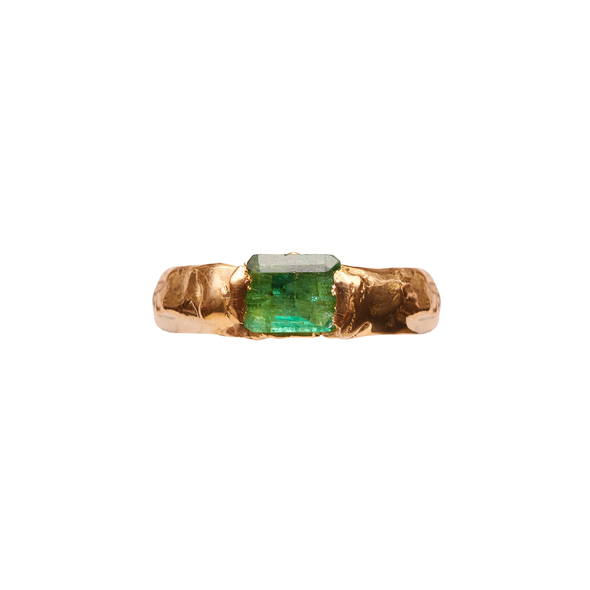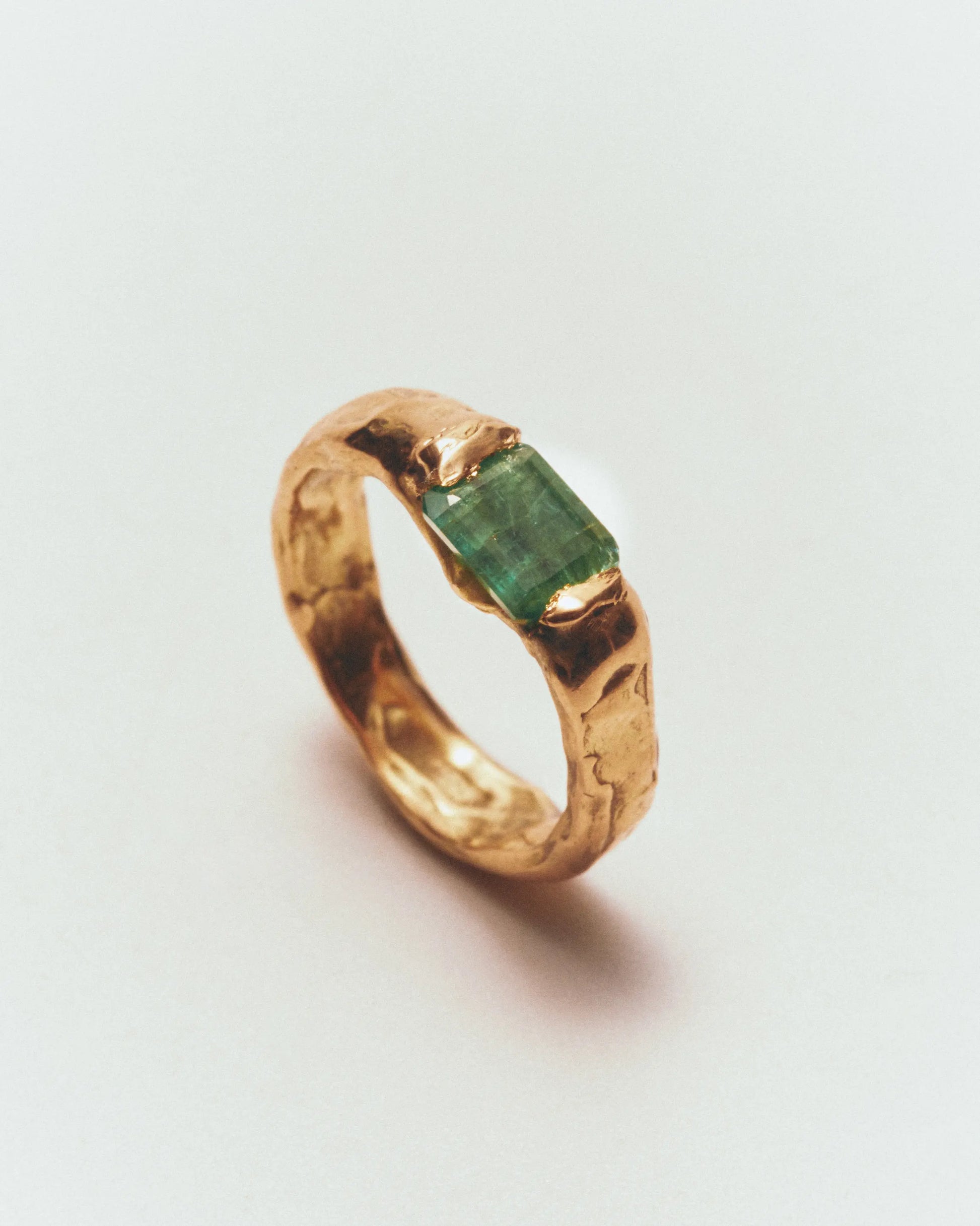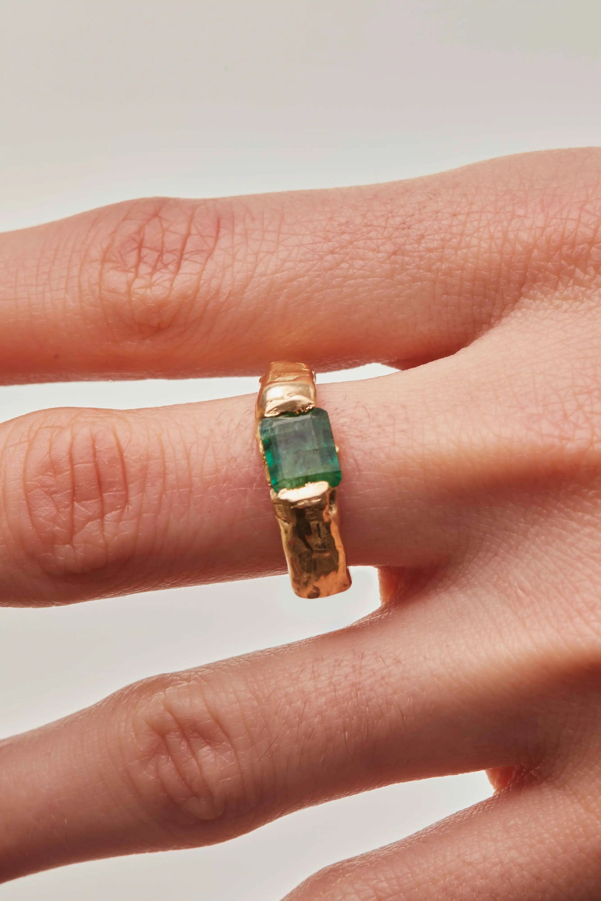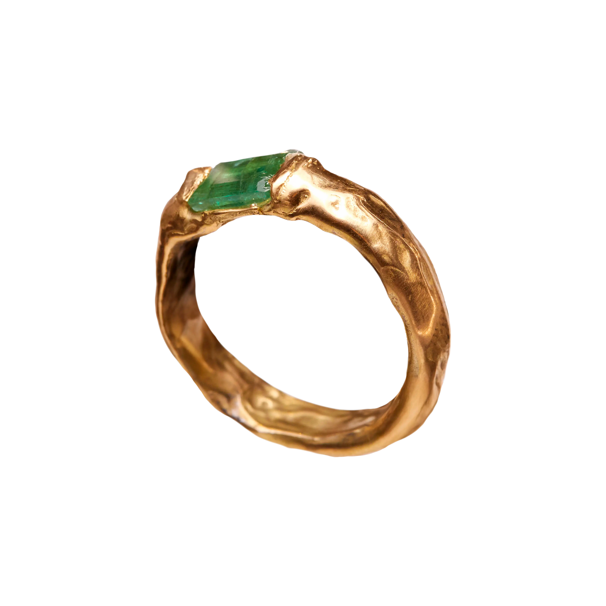Solid gold ring handcrafted in a unique way, featuring a one-of-a-kind emerald. Each stone is carefully selected, ensuring no two are ever the same. Crafted in 18k solid gold, a piece created to stand by you and by many generations.