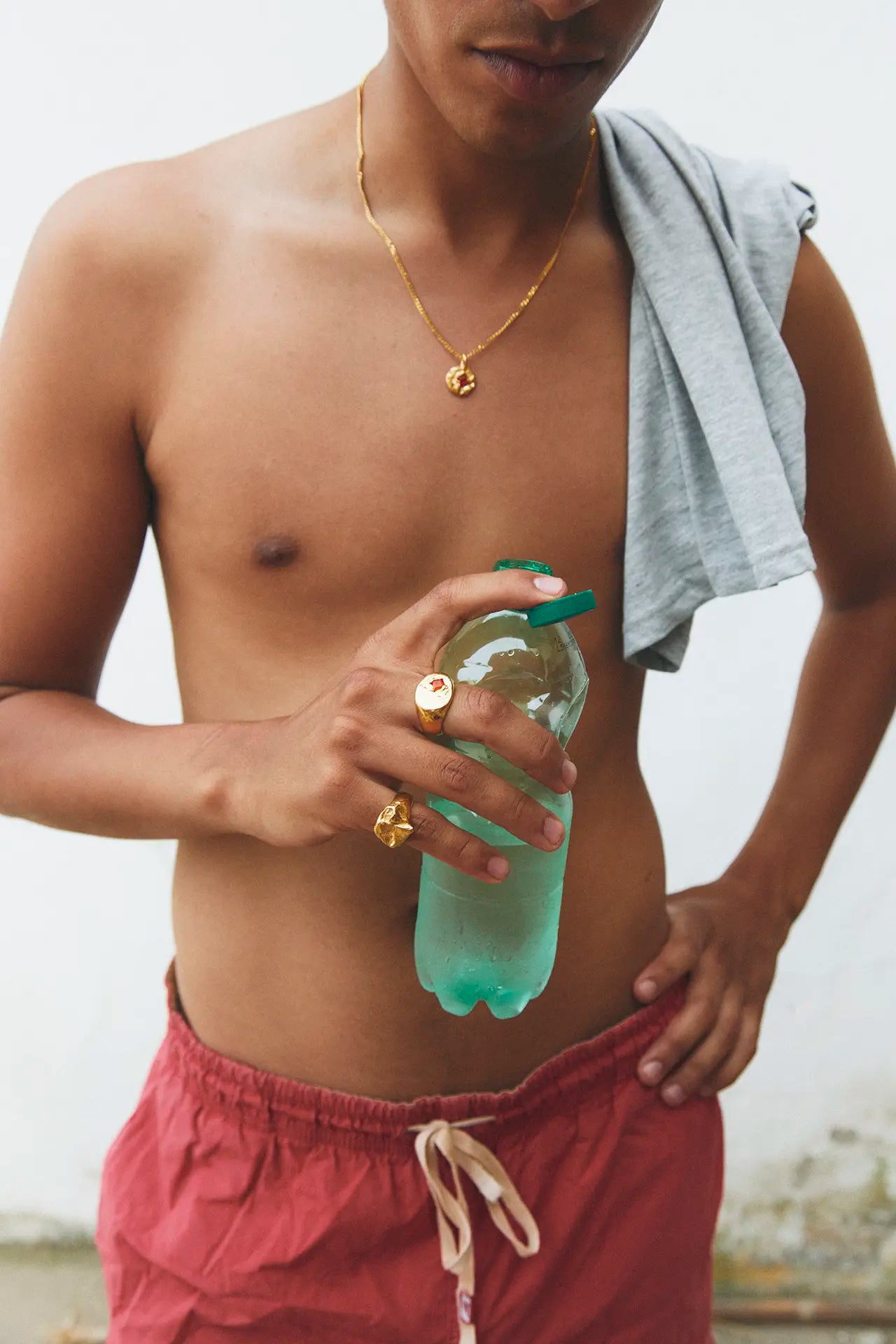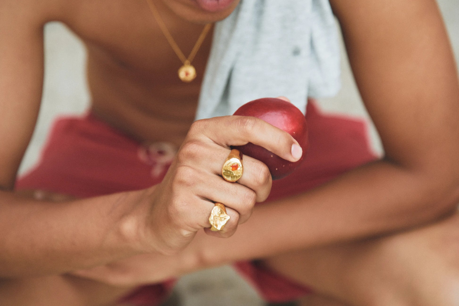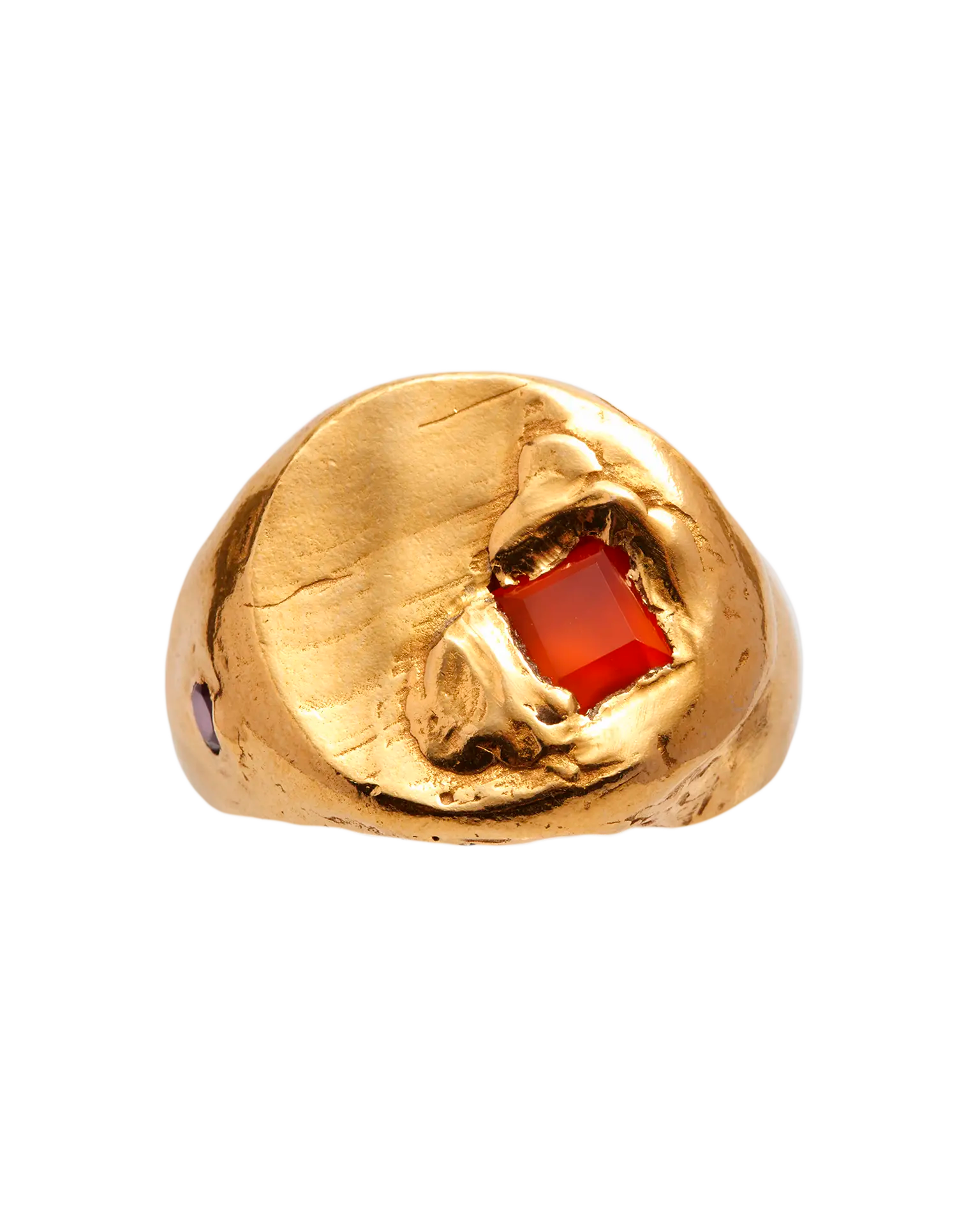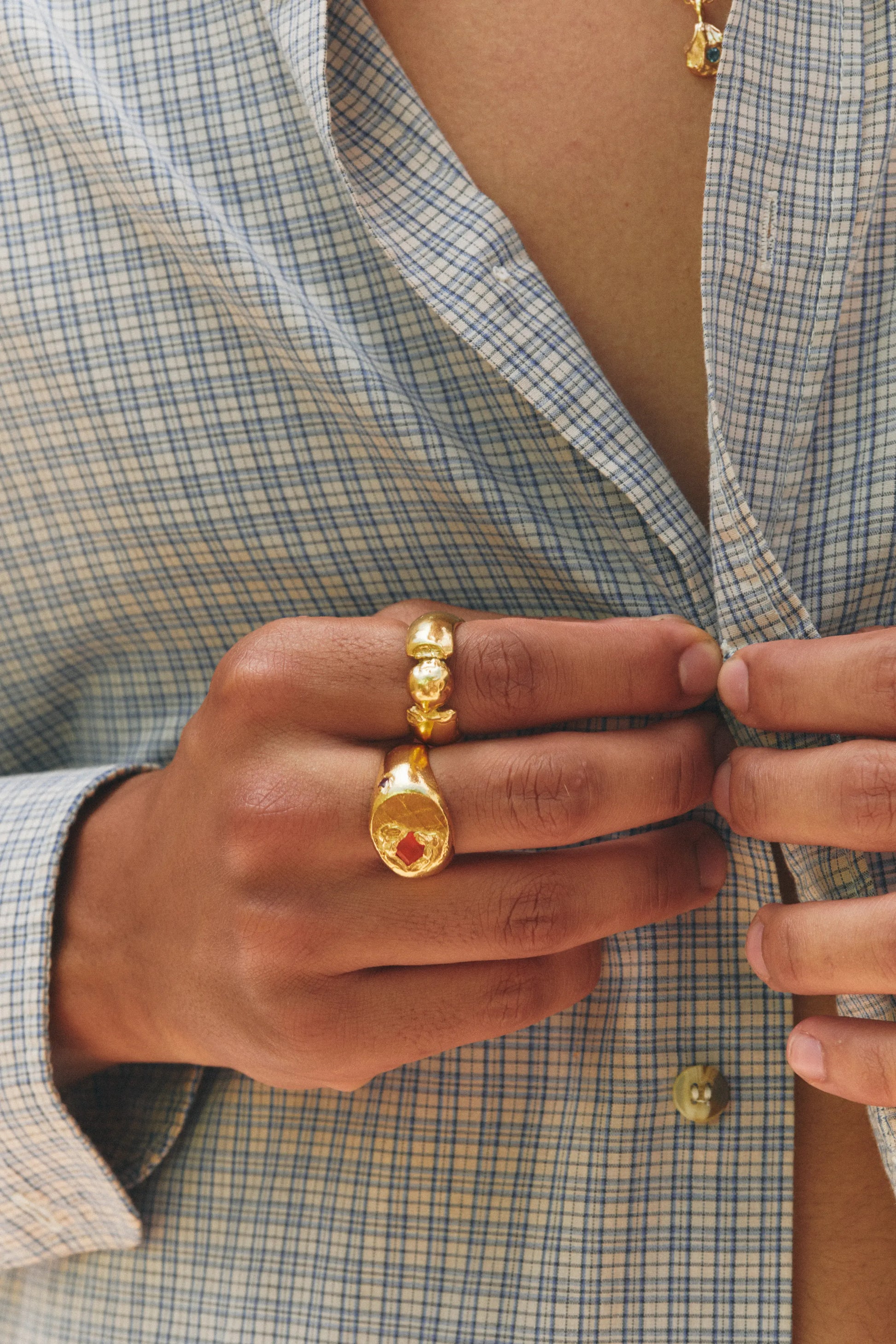 Sello Norte, handmade gold plated recycled 925 sterling silver ring with natural Red Onyx and Rose Garnet stones.
