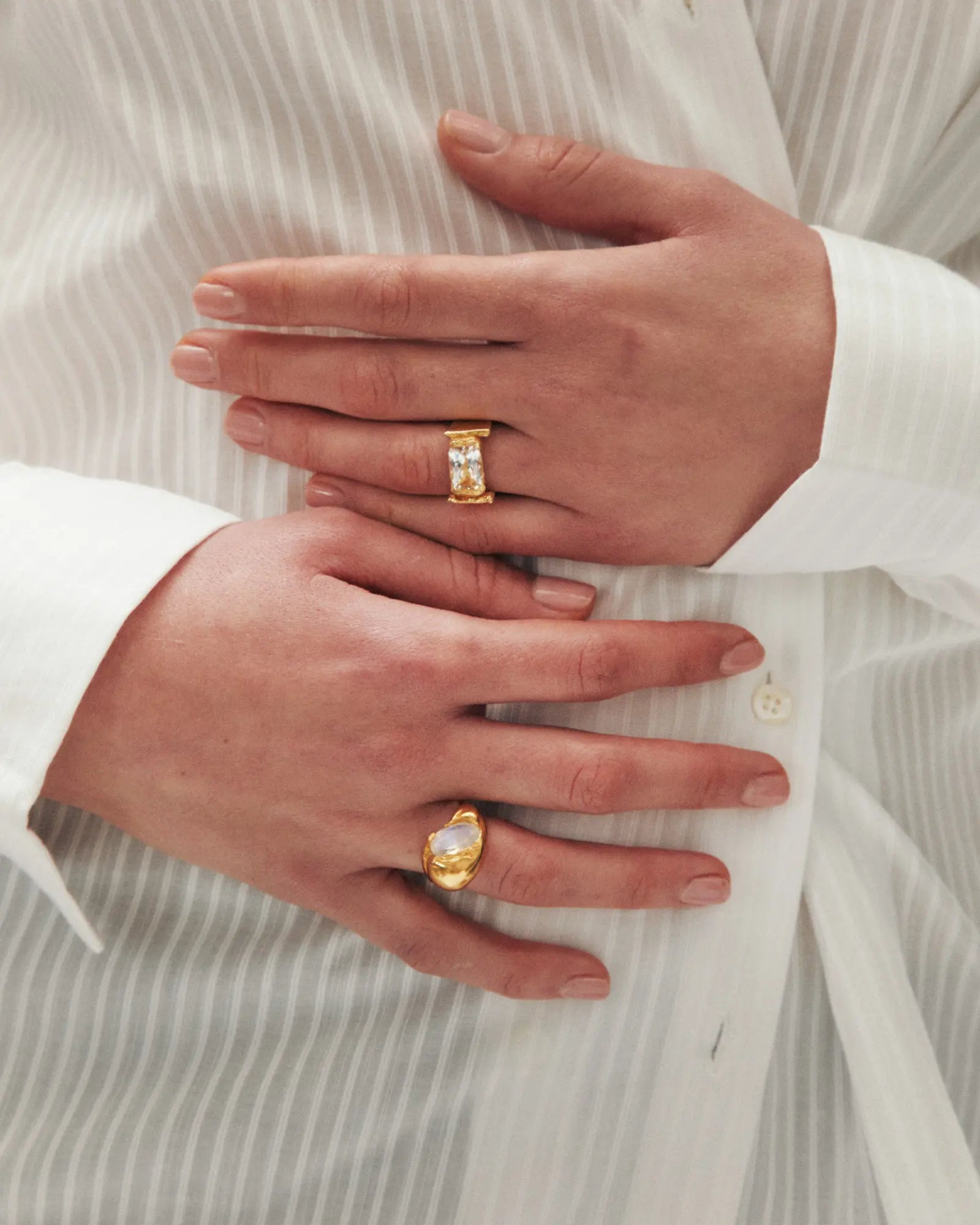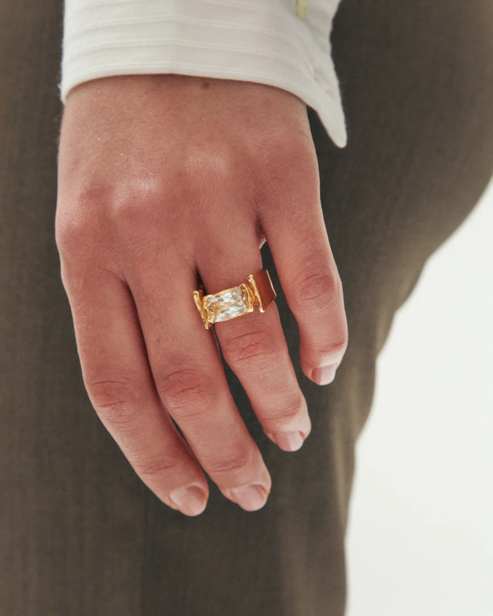Abril, handmade gold plated recycled 925 sterling silver ring with a natural White Topaz gem.