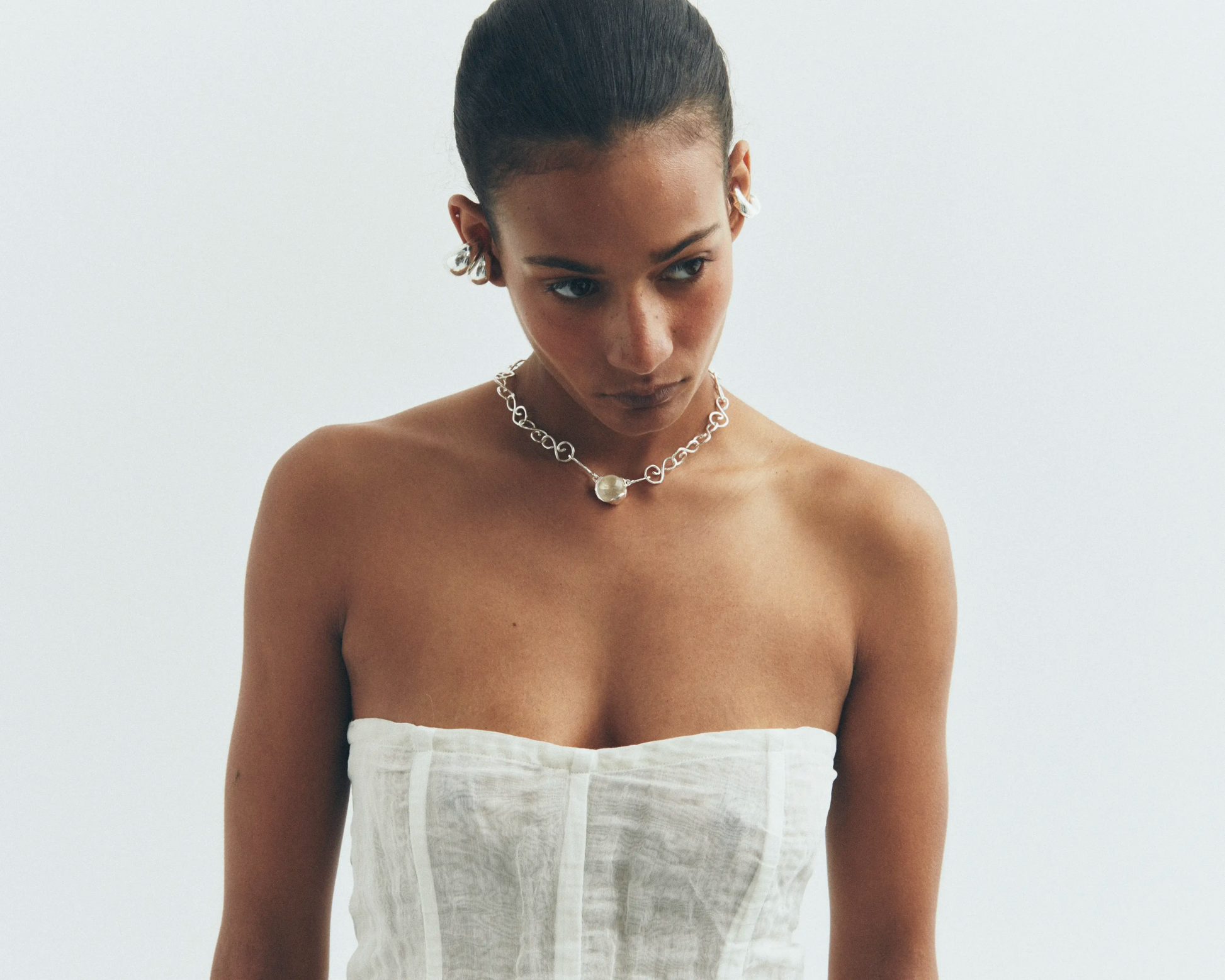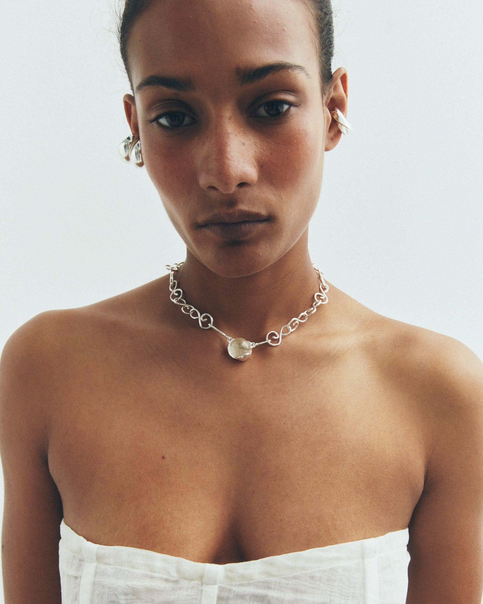 Fruto Choker Agua, handmade recycled 925 sterling silver chain with white crystal stone.