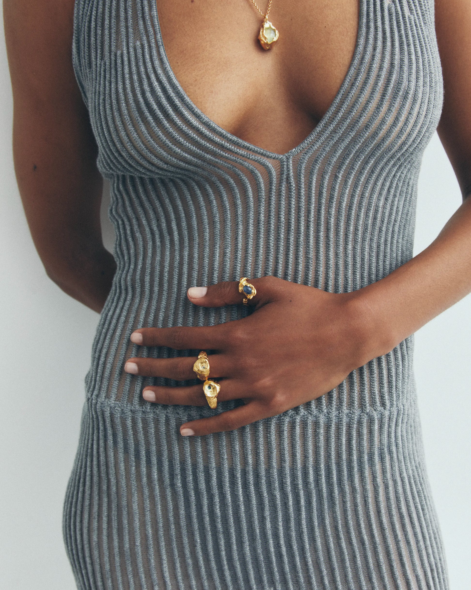 Marea Clear, handmade gold plated recycled 925 sterling silver ring with natural Green Amatyste stone.