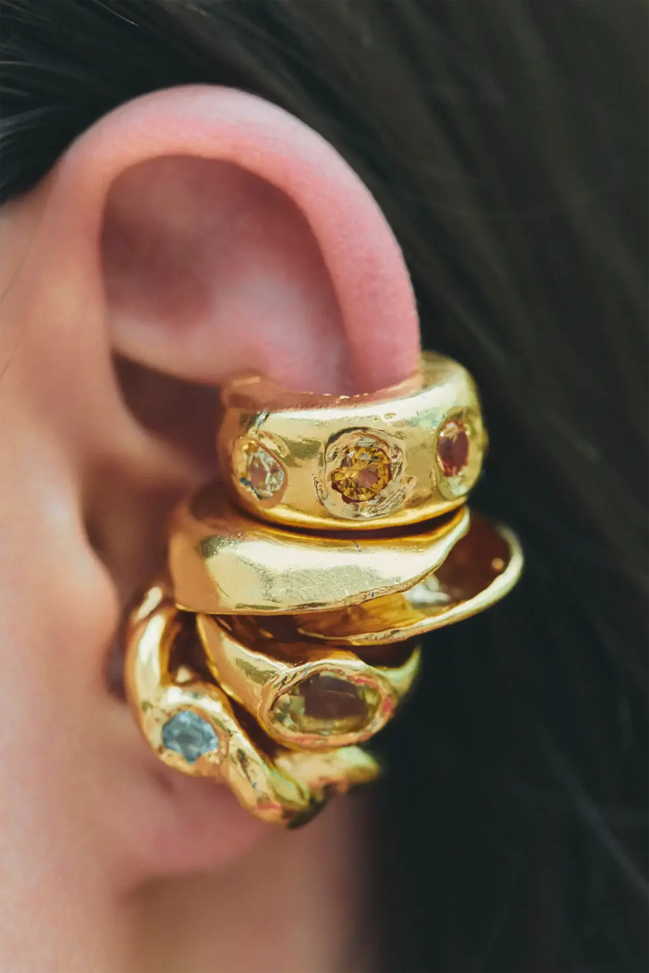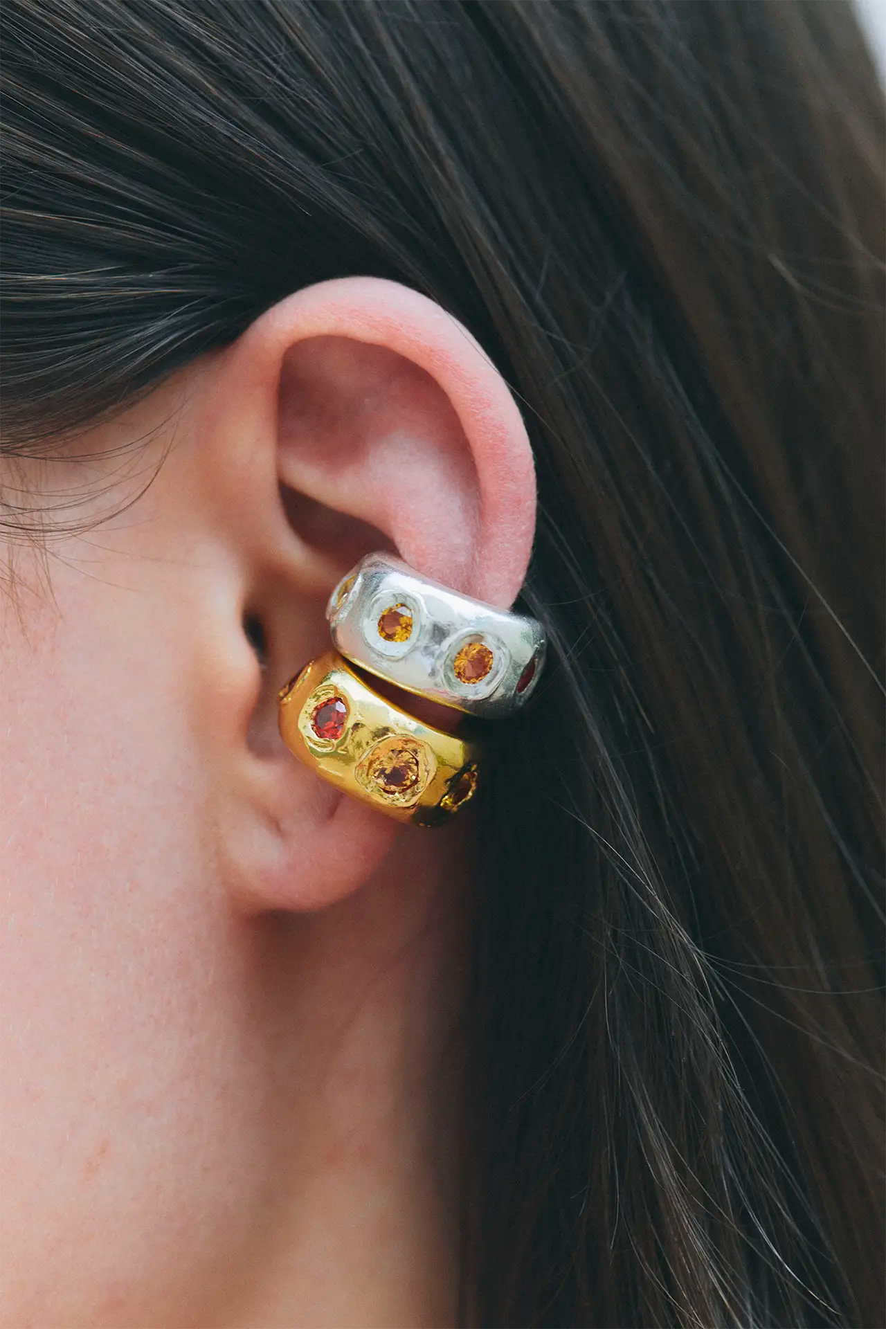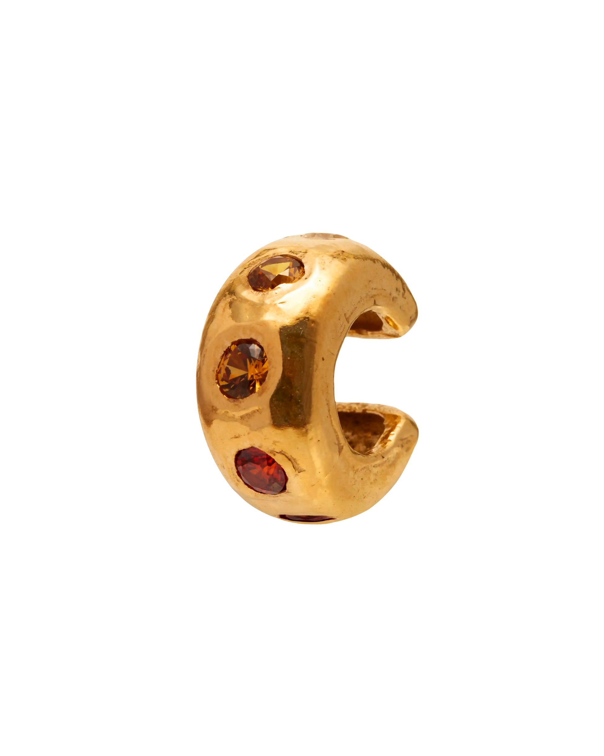 Sol, handmade gold plated ear cuff with Red Cubic Zirconia, Lab-Grown Orange and Yellow Sapphire stones.