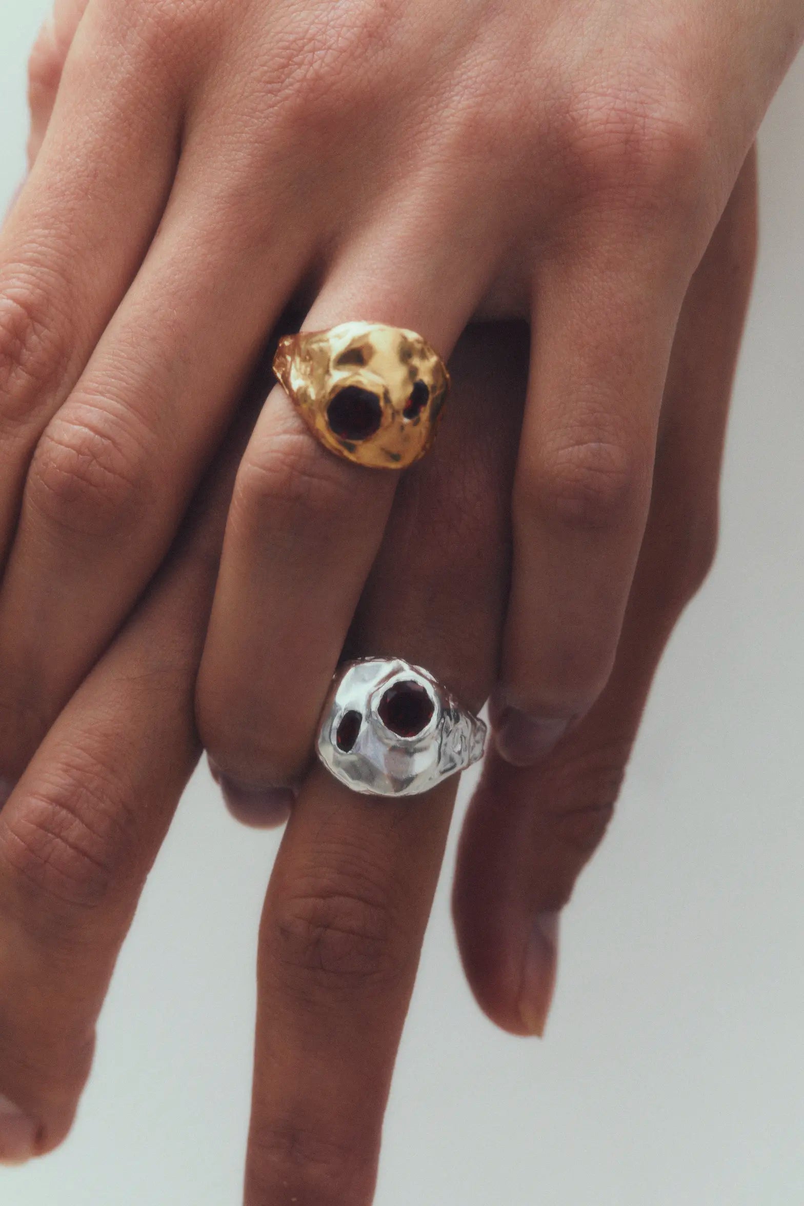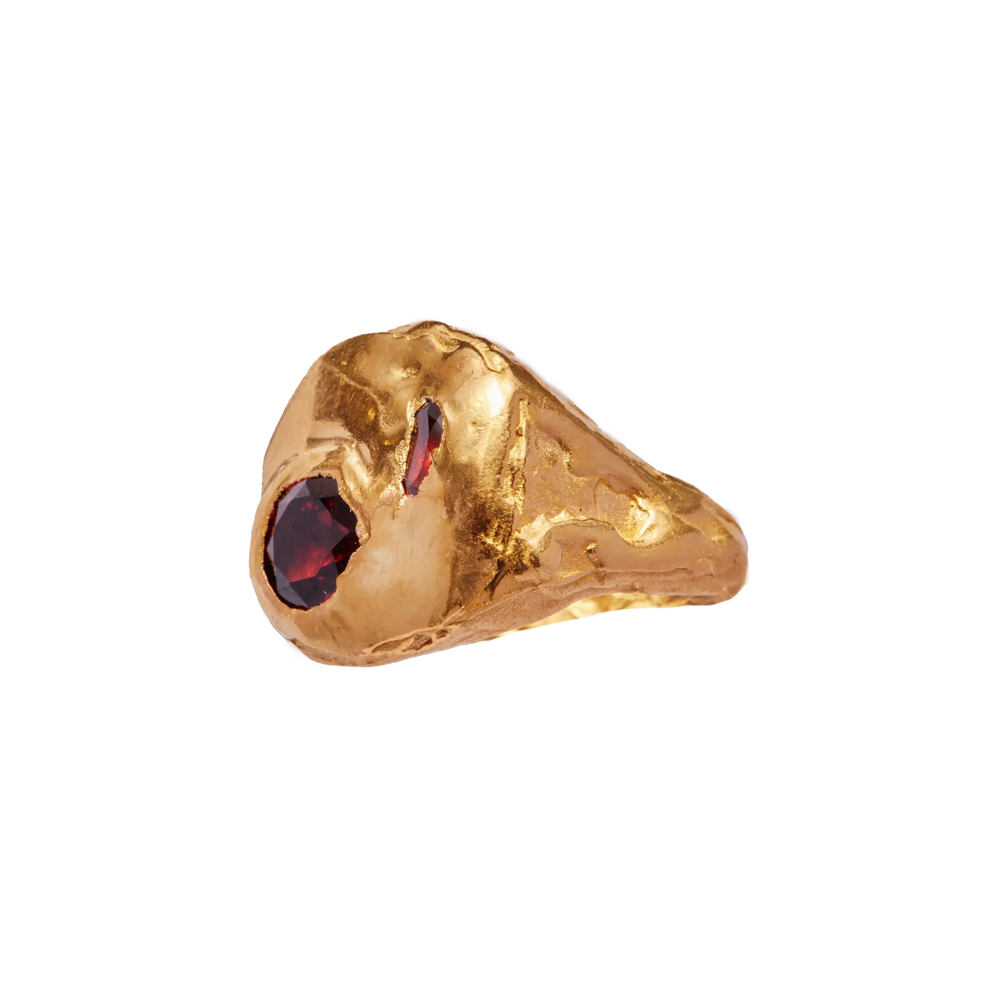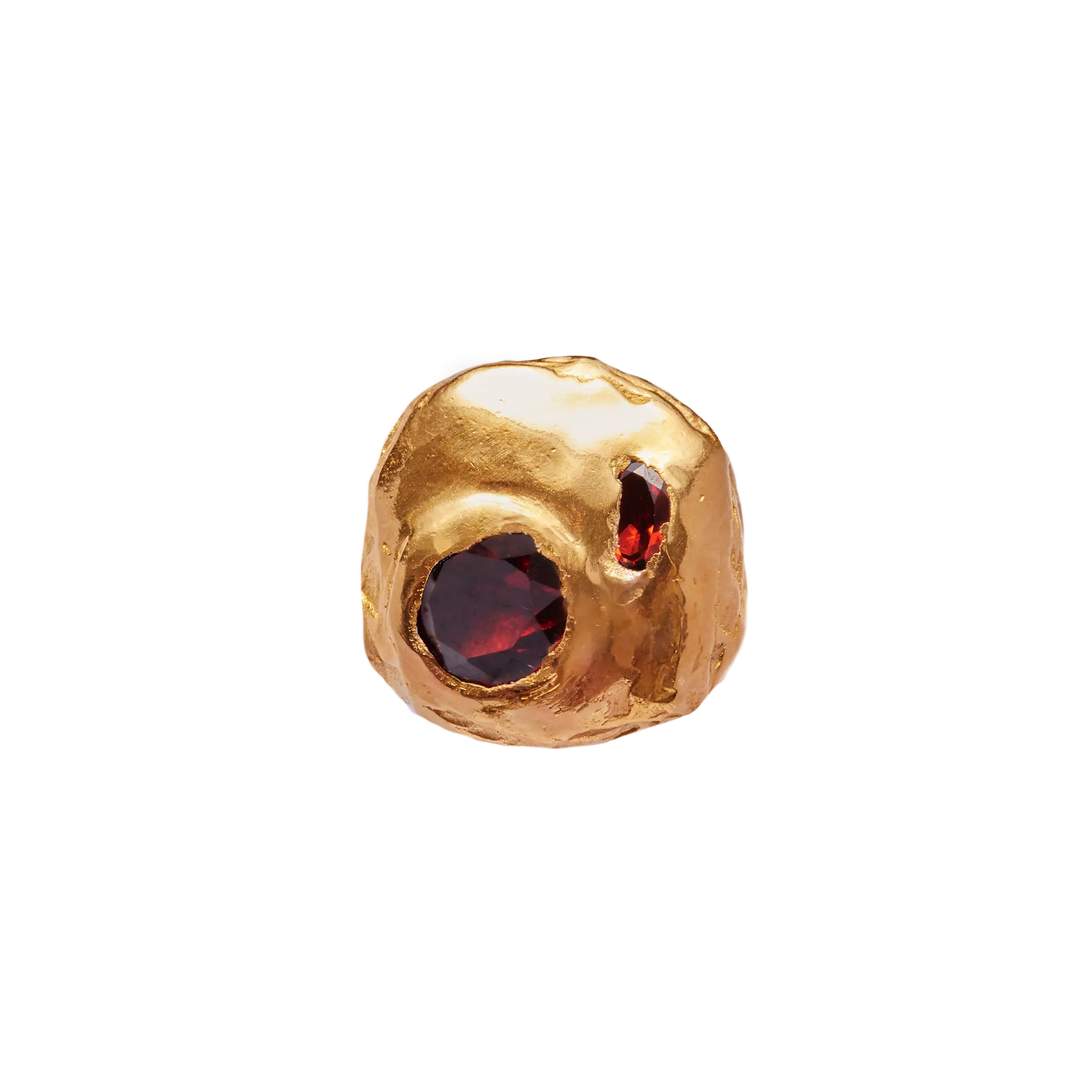 Coco, anillo artesanal de plata de ley 925 reciclada bañada en oro con piedra natural granate rojo.