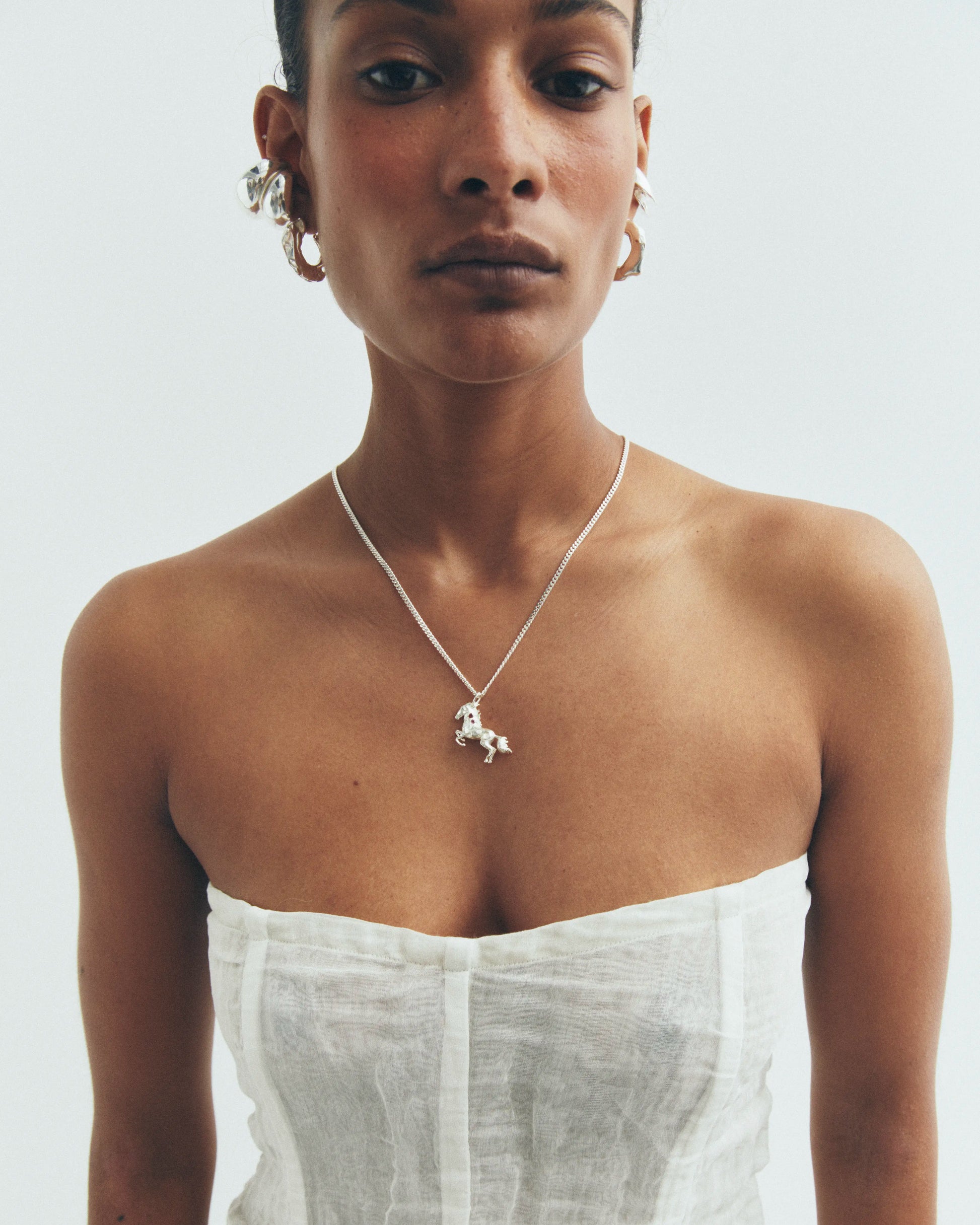 Caballo, colgante artesanal de plata de ley 925 reciclada con piedras naturales de topacio azul oscuro, peridoto verde, citrino naranja y cuarzo rosa.