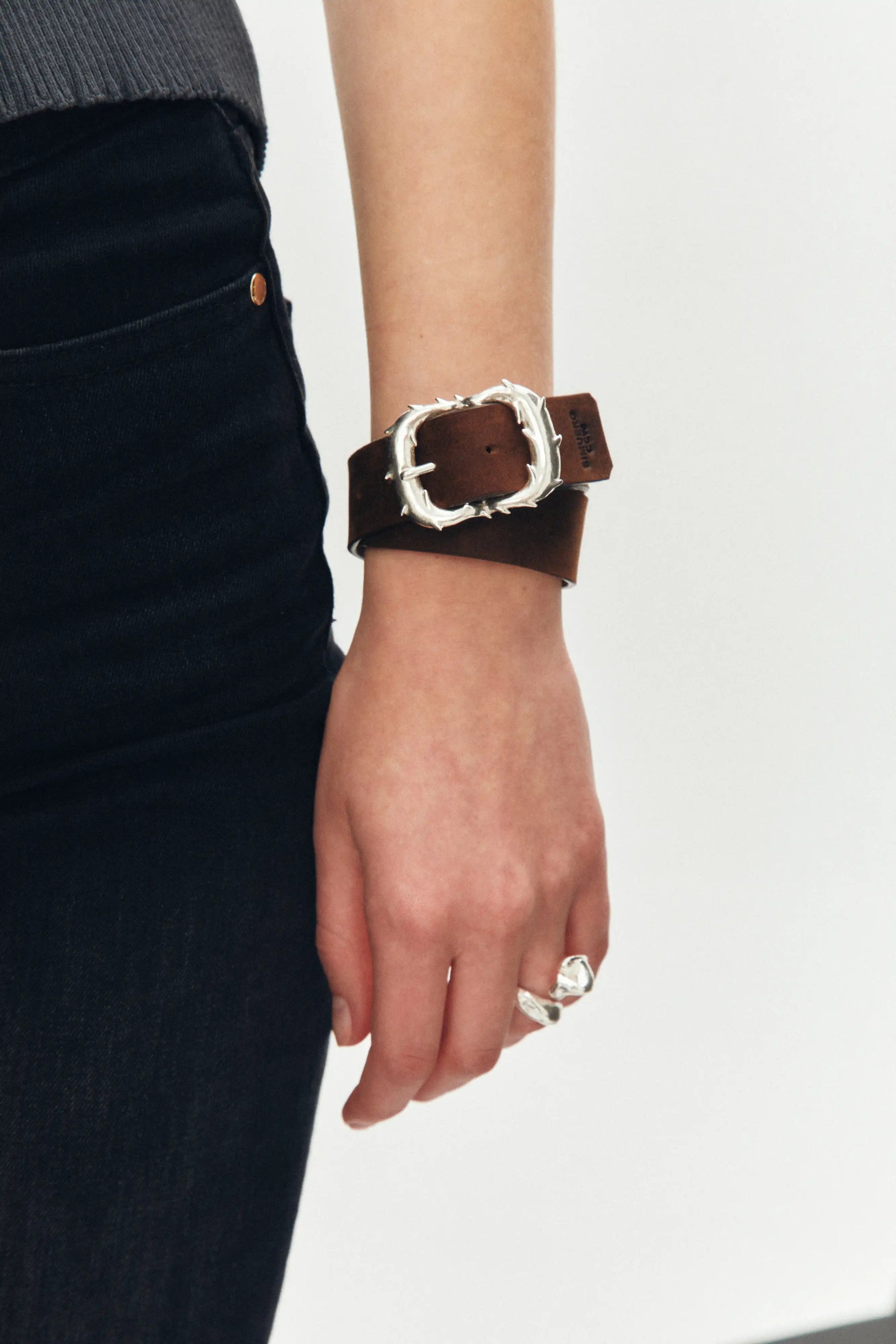 Espina Bracelet, brazalete artesanal de cuero con un eslabón escultórico de plata de ley 925 reciclada en forma de espina, meticulosamente elaborado para reflejar nitidez y textura en cada detalle. Confeccionado con materiales de origen responsable en colaboración con un taller local especializado en cuero. Diseñado y fabricado íntegramente en Valencia, España.