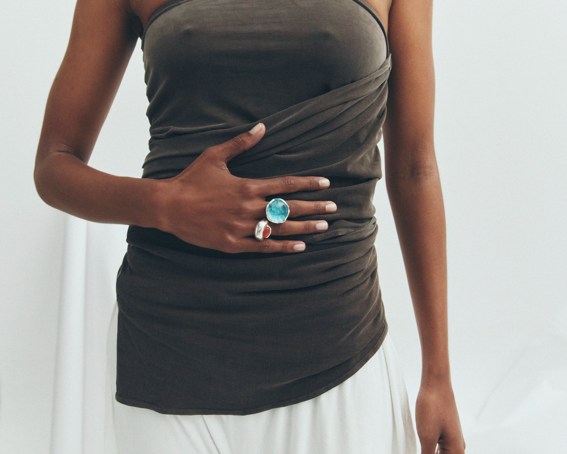 Atolón Blue, anillo artesanal de plata de ley 925 reciclada con piedra de cristal azul.