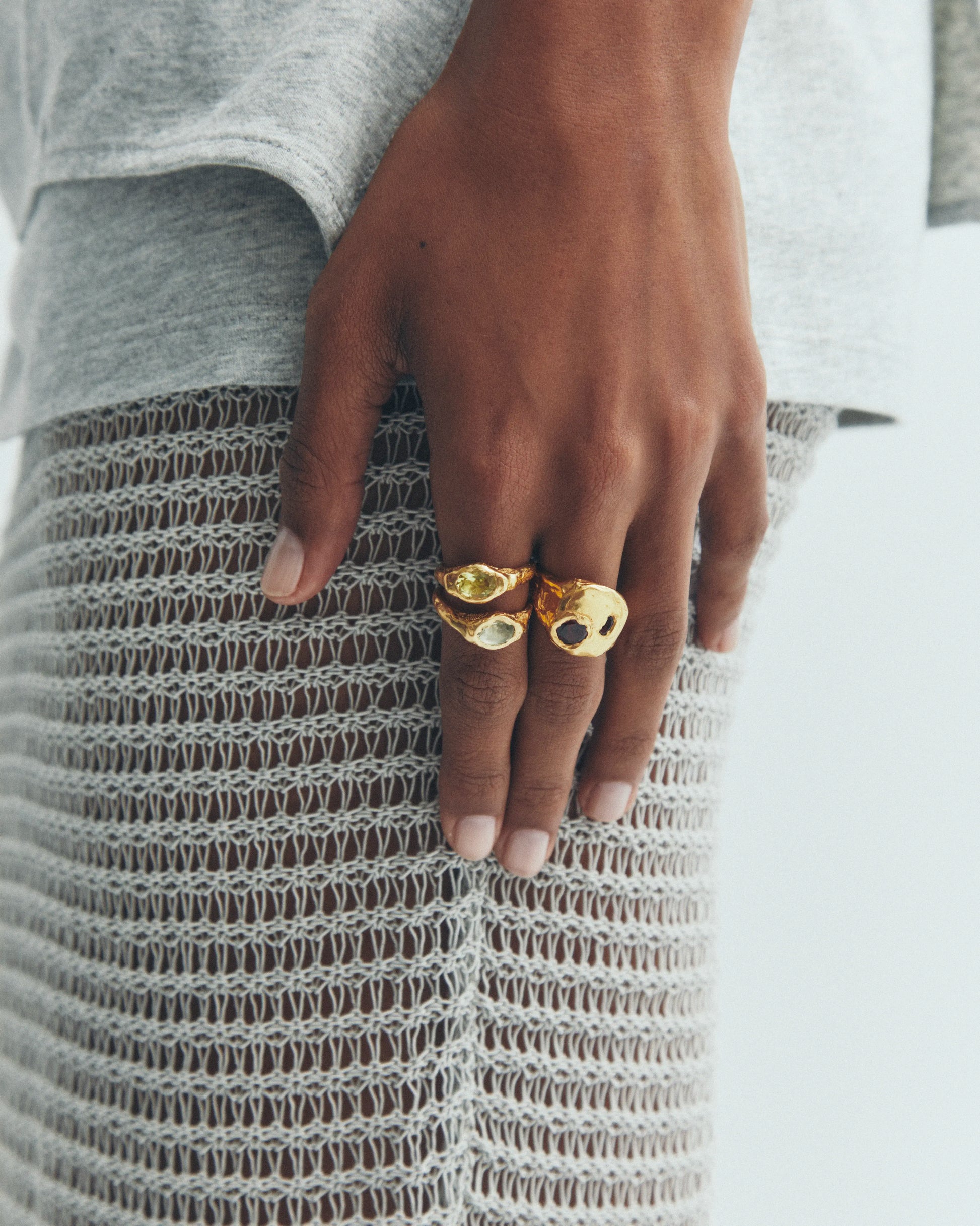 Coco, anillo artesanal de plata de ley 925 reciclada bañada en oro con piedra natural granate rojo.