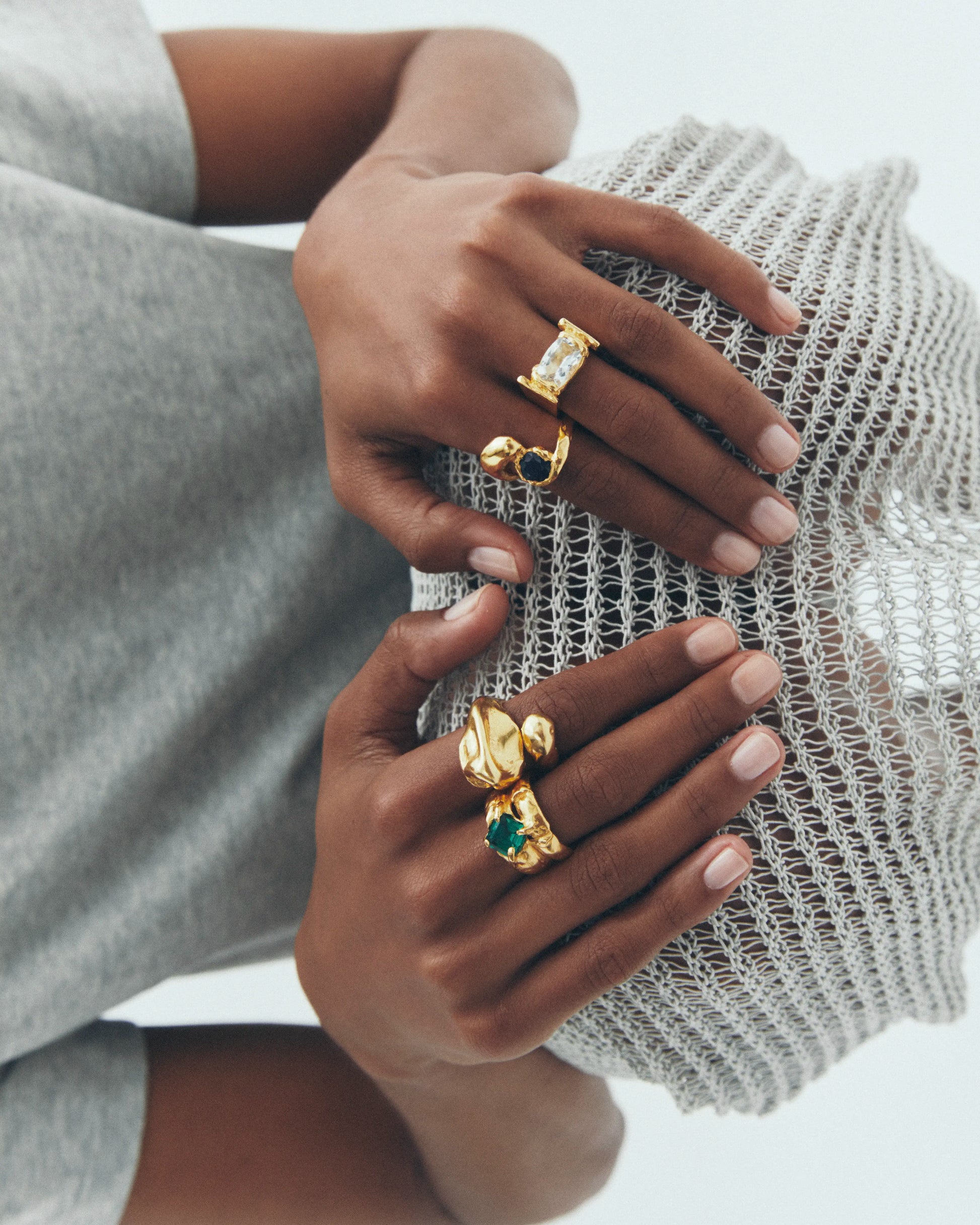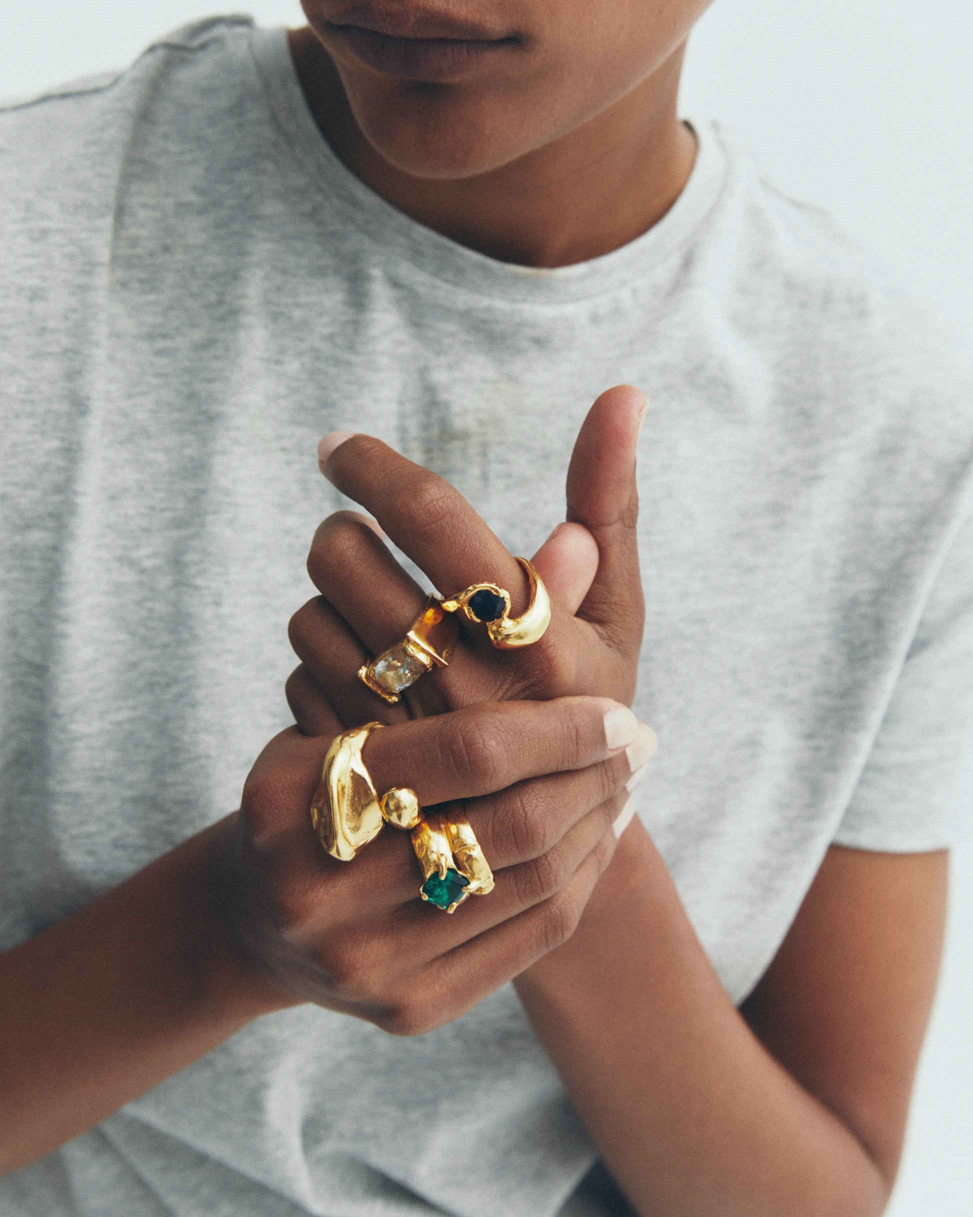 Septiembre, anillo artesanal de plata de ley 925 reciclada bañado en oro con piedra natural de zafiro azul.