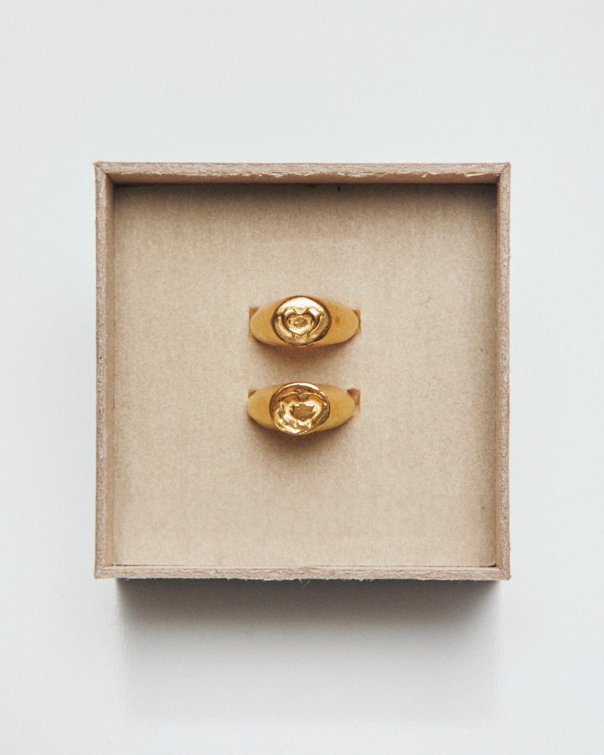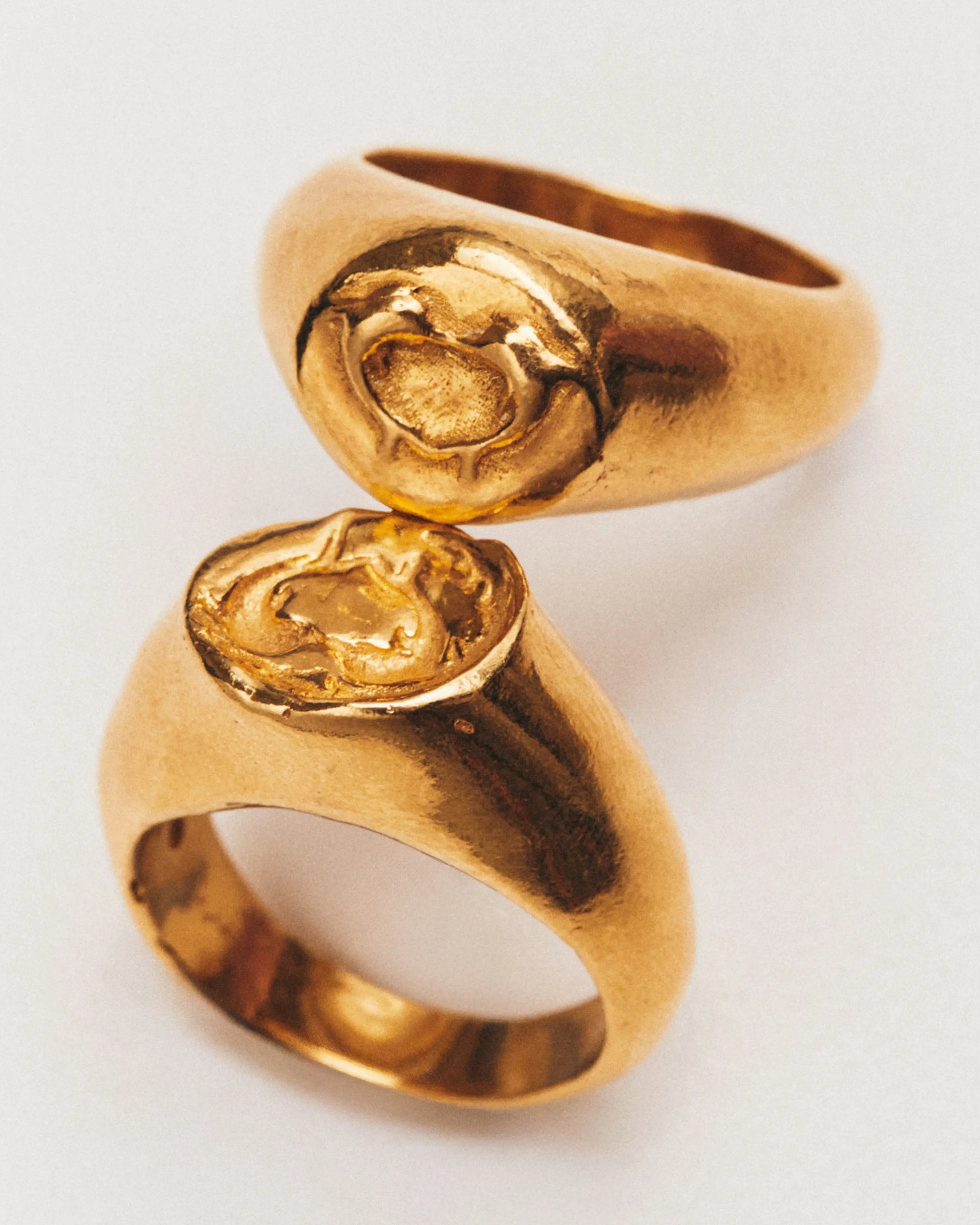 Beso Set Gold, set de anillos artesanales en plata de ley 925 reciclada bañada en oro. Dos piezas complementarias que encajan y forman una sola figura. Creado para ser compartido.