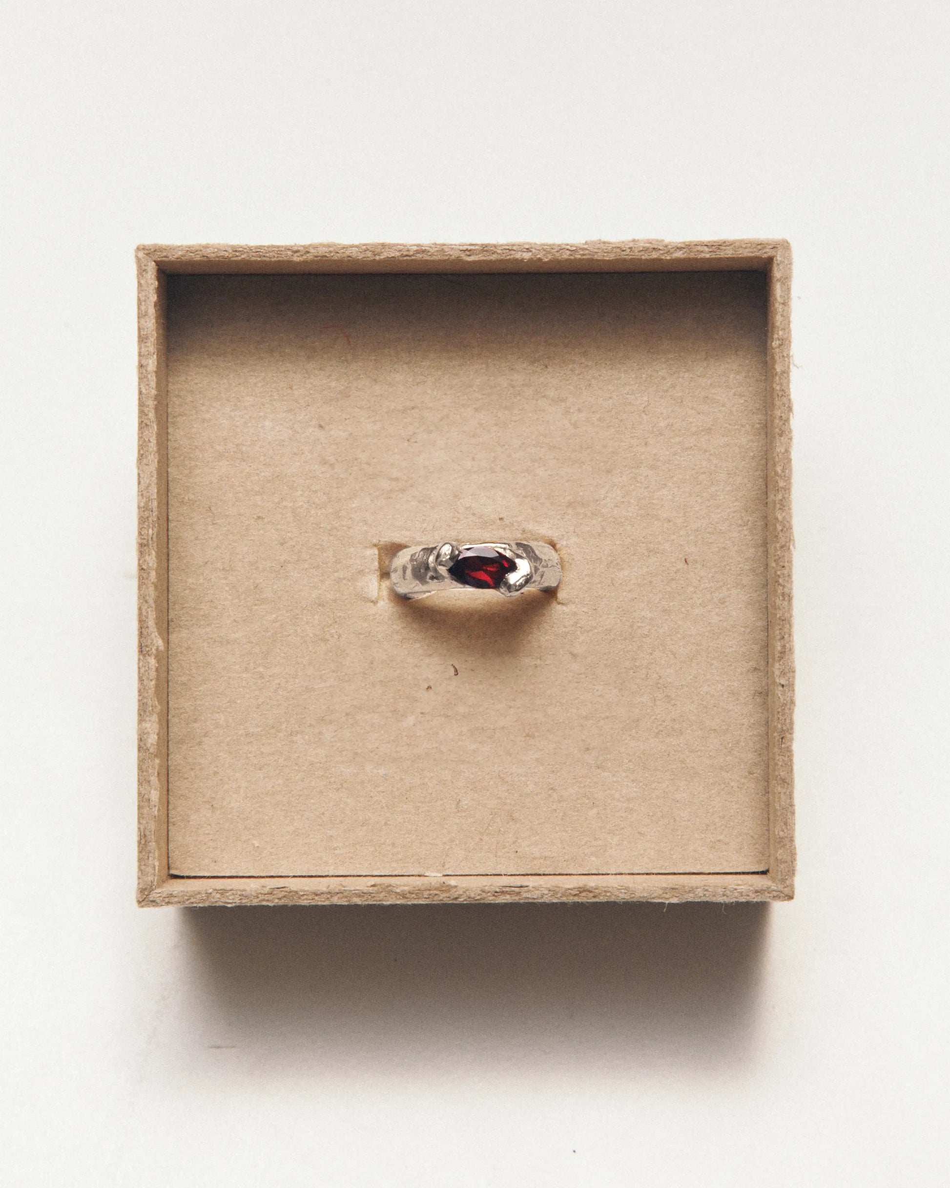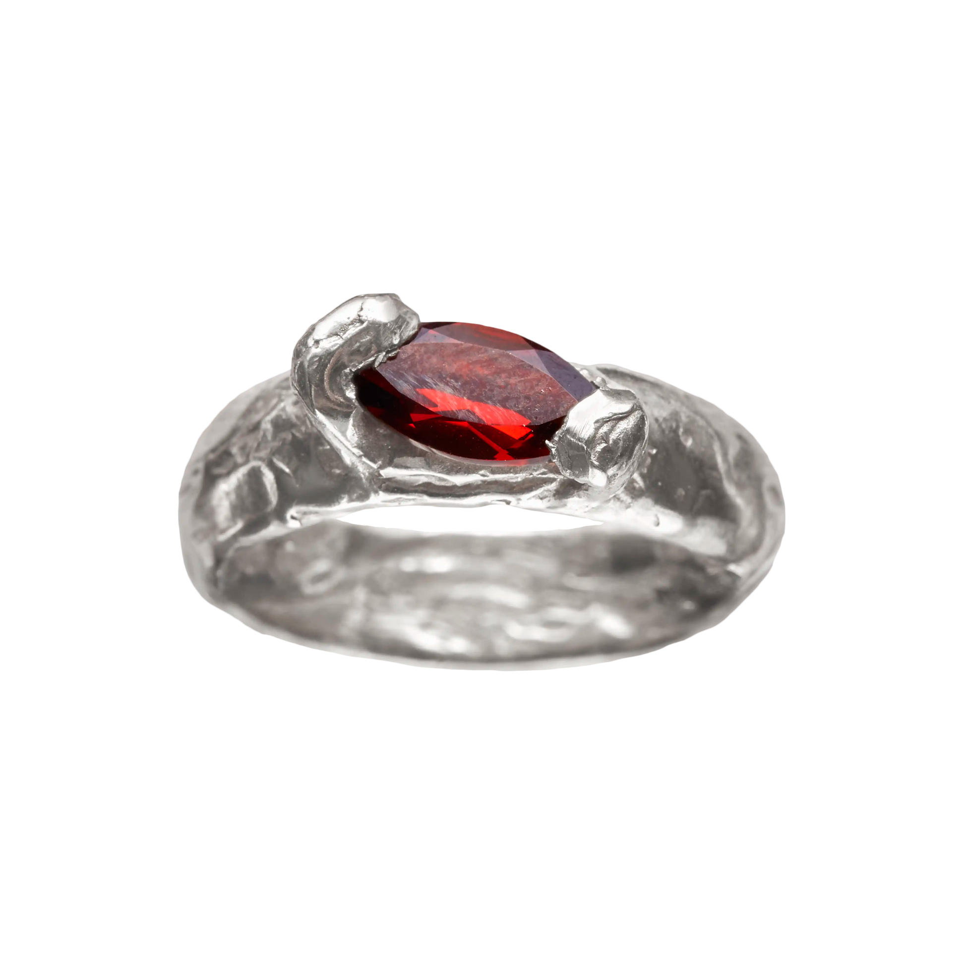 Enero, anillo artesanal de plata de ley 925 reciclada con piedra natural de granate.