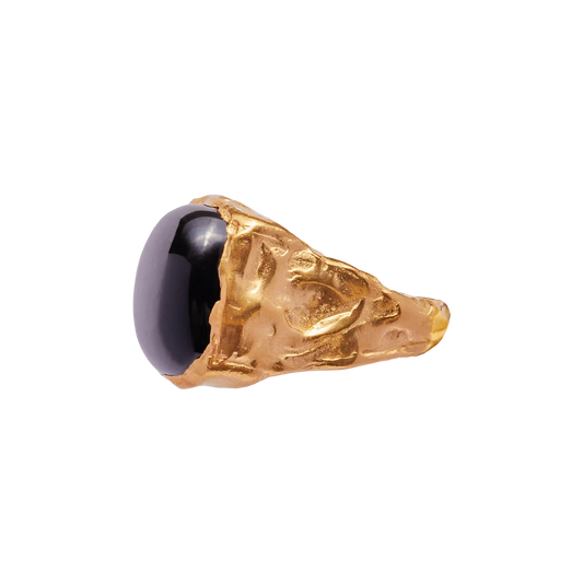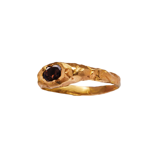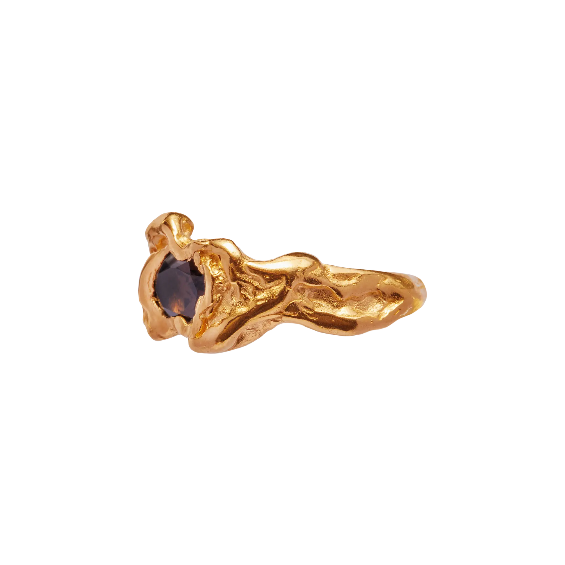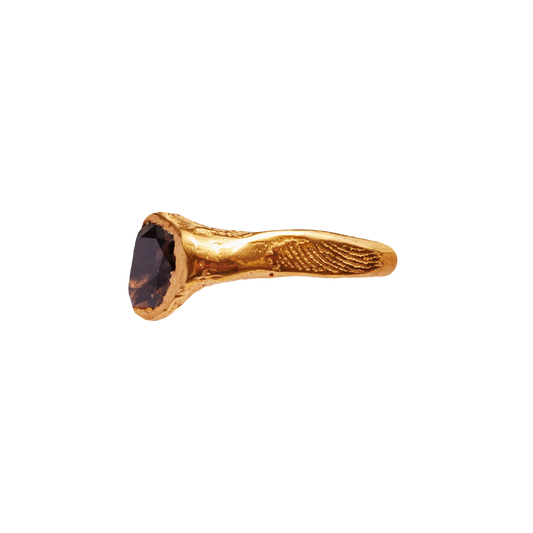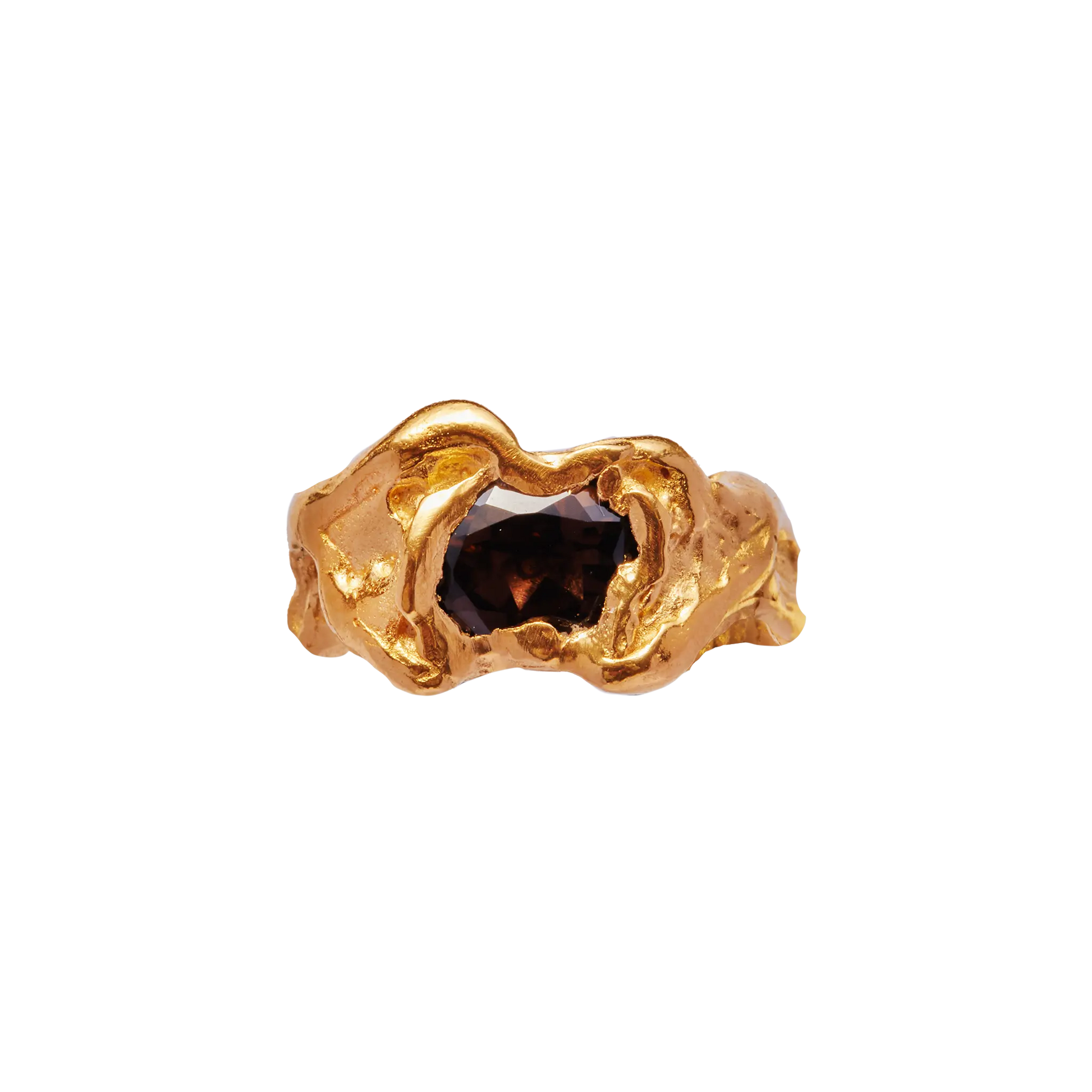 Ola Brown, anillo artesanal de plata de ley 925 reciclada bañada en oro con piedra natural de cuarzo ahumado.
