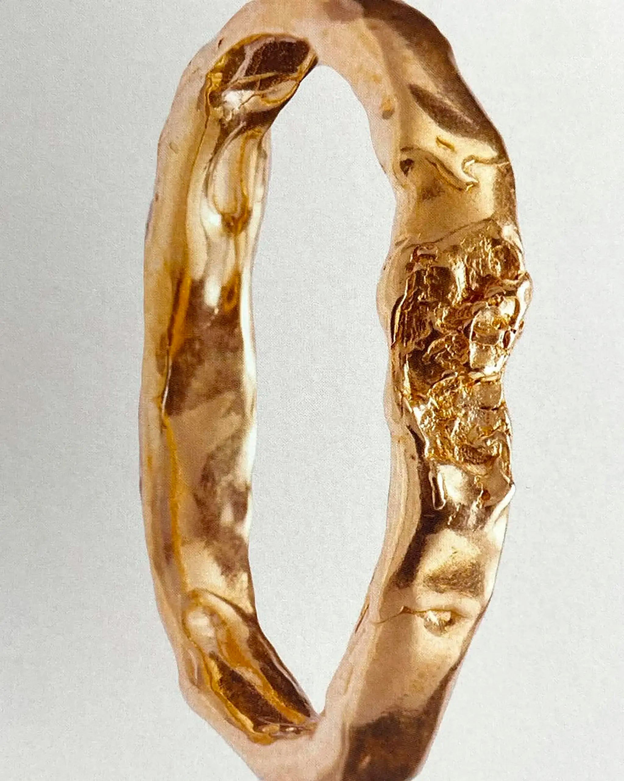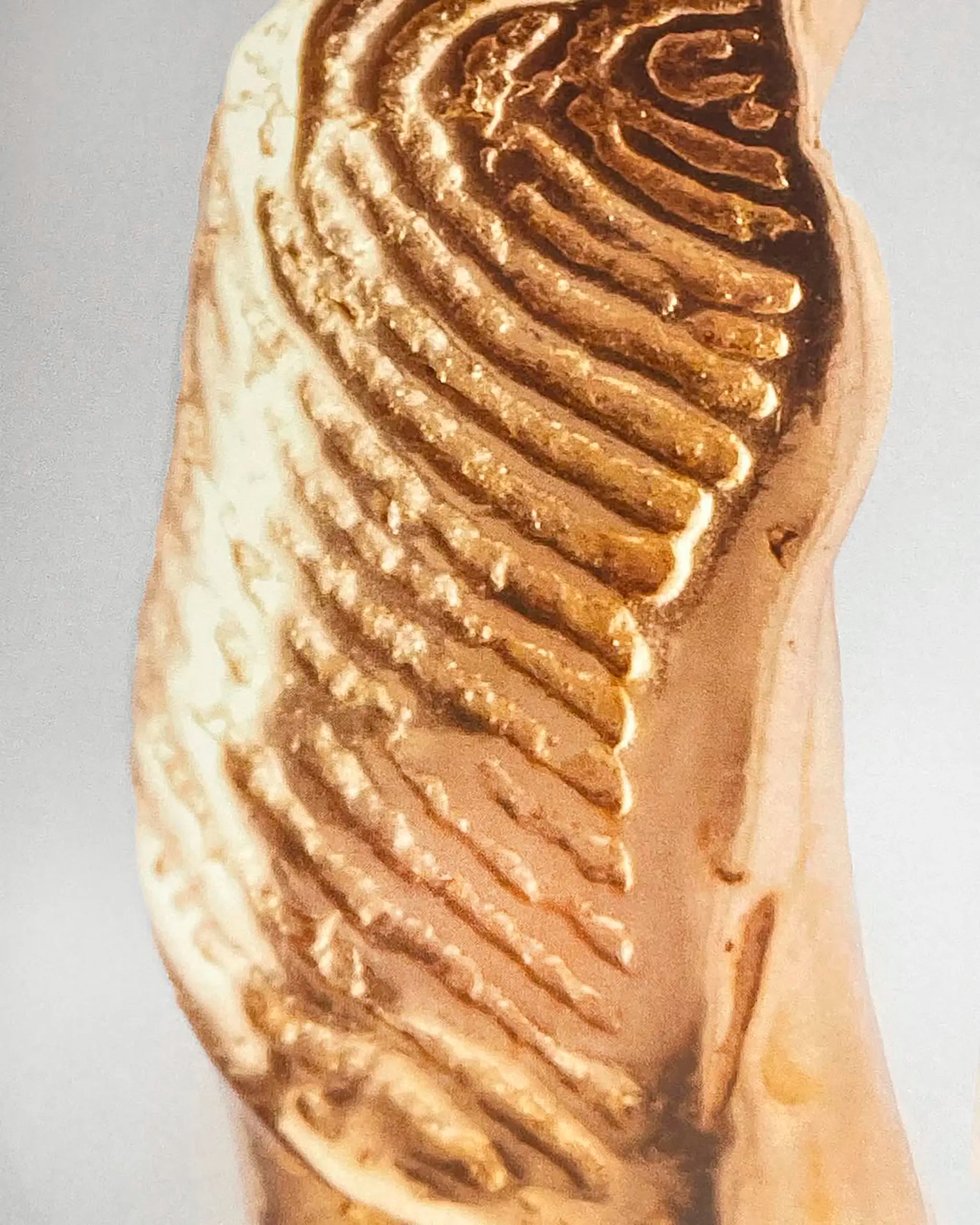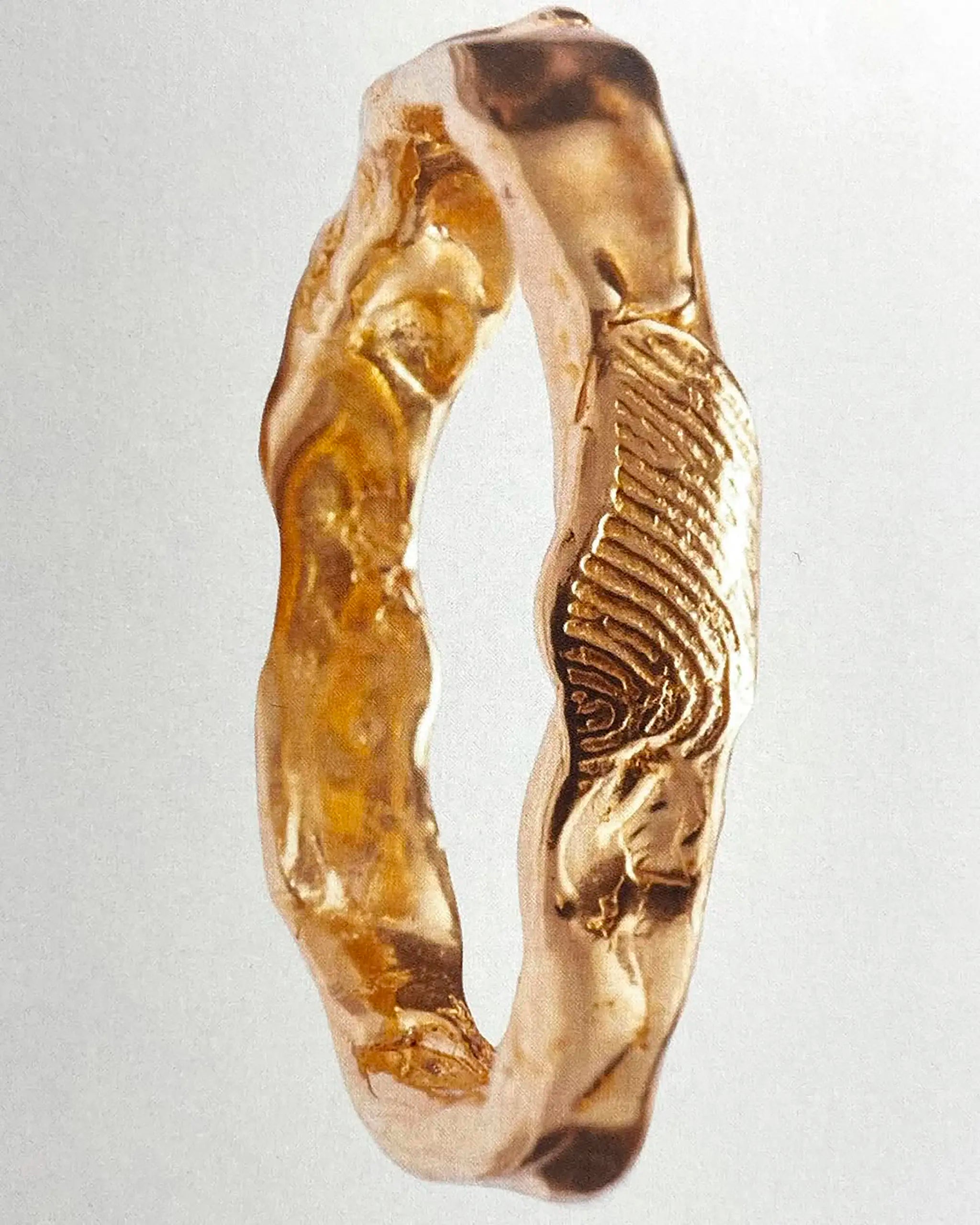 During the wax modeling process, each person presses their fingerprint into the wax, embedding their touch into the design. This creates an organic, one-of-a-kind texture that is preserved forever when cast in gold.