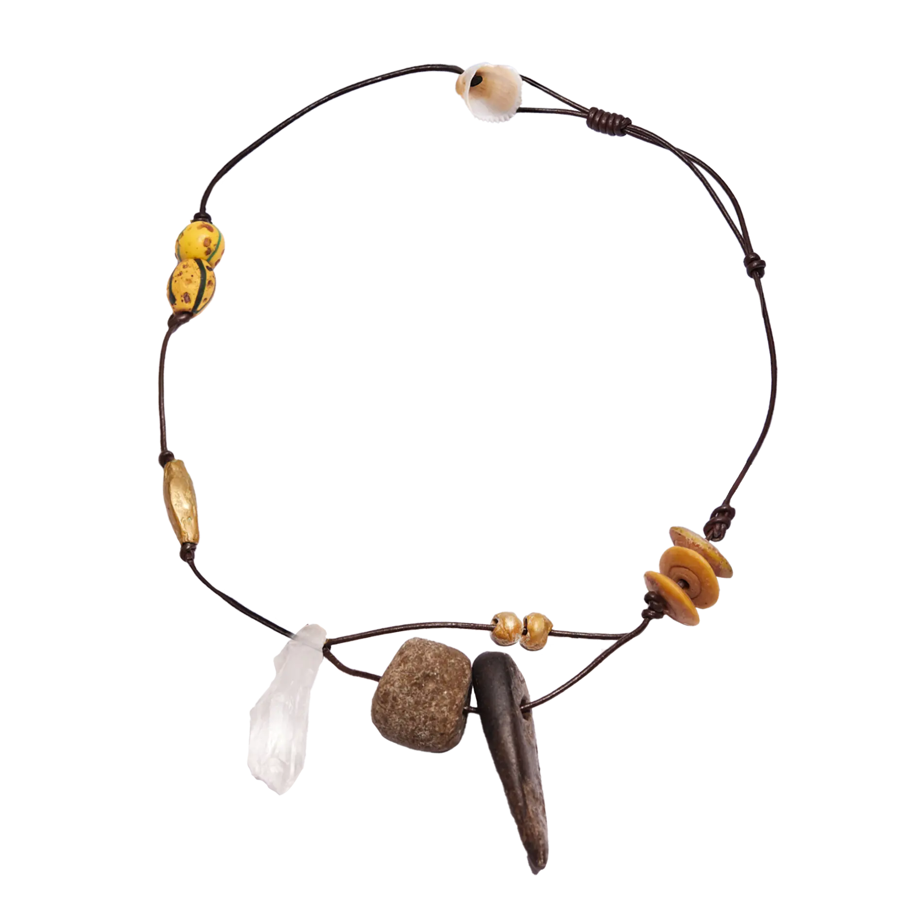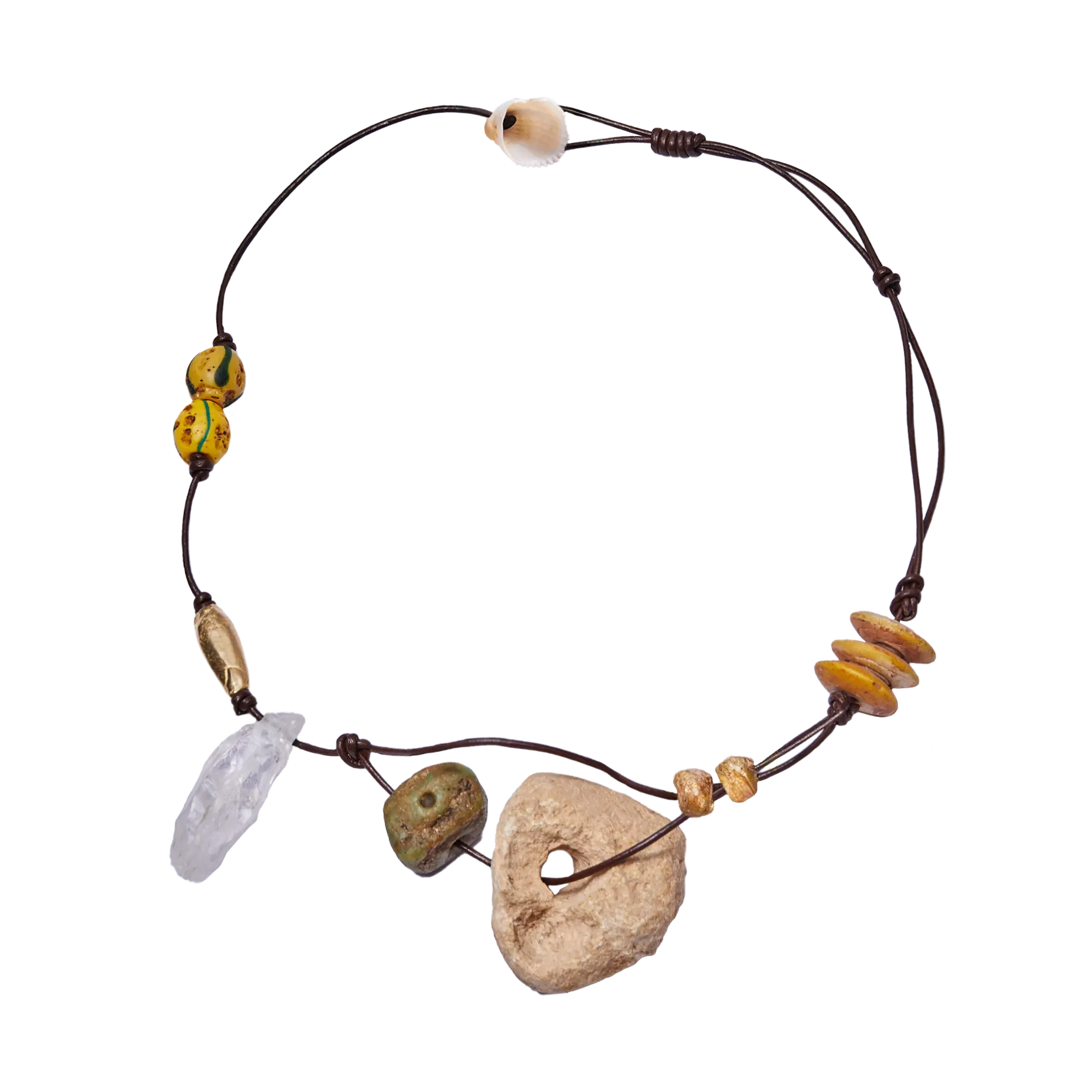 Exclusive handmade necklaces crafted with historical stone beads, recycled brass, 19th-century Venetian beads, marine pieces, vintage glass beads and an unique closure made with a natural sea shell.