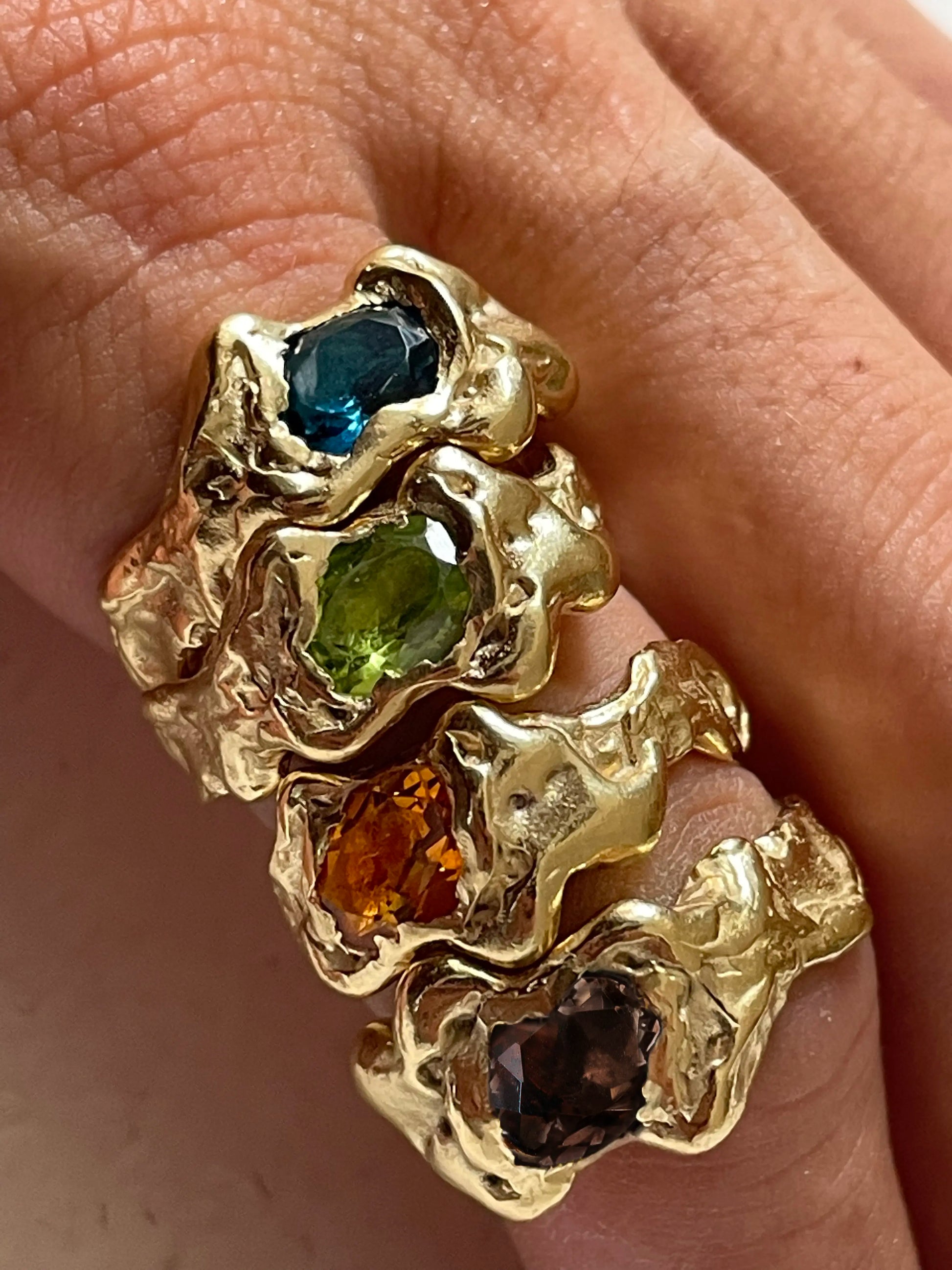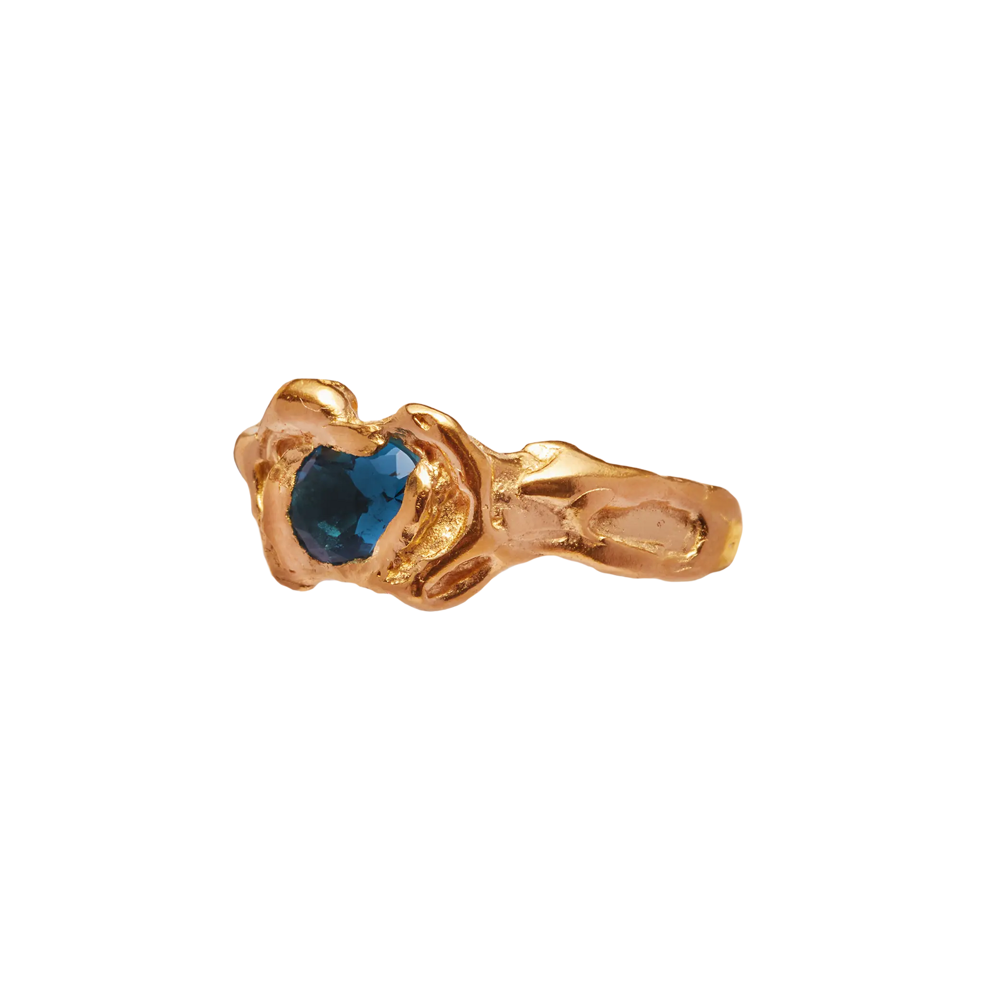 Ola Blue, handmade gold plated recycled 925 sterling silver ring with blue Topaz Cz stone.